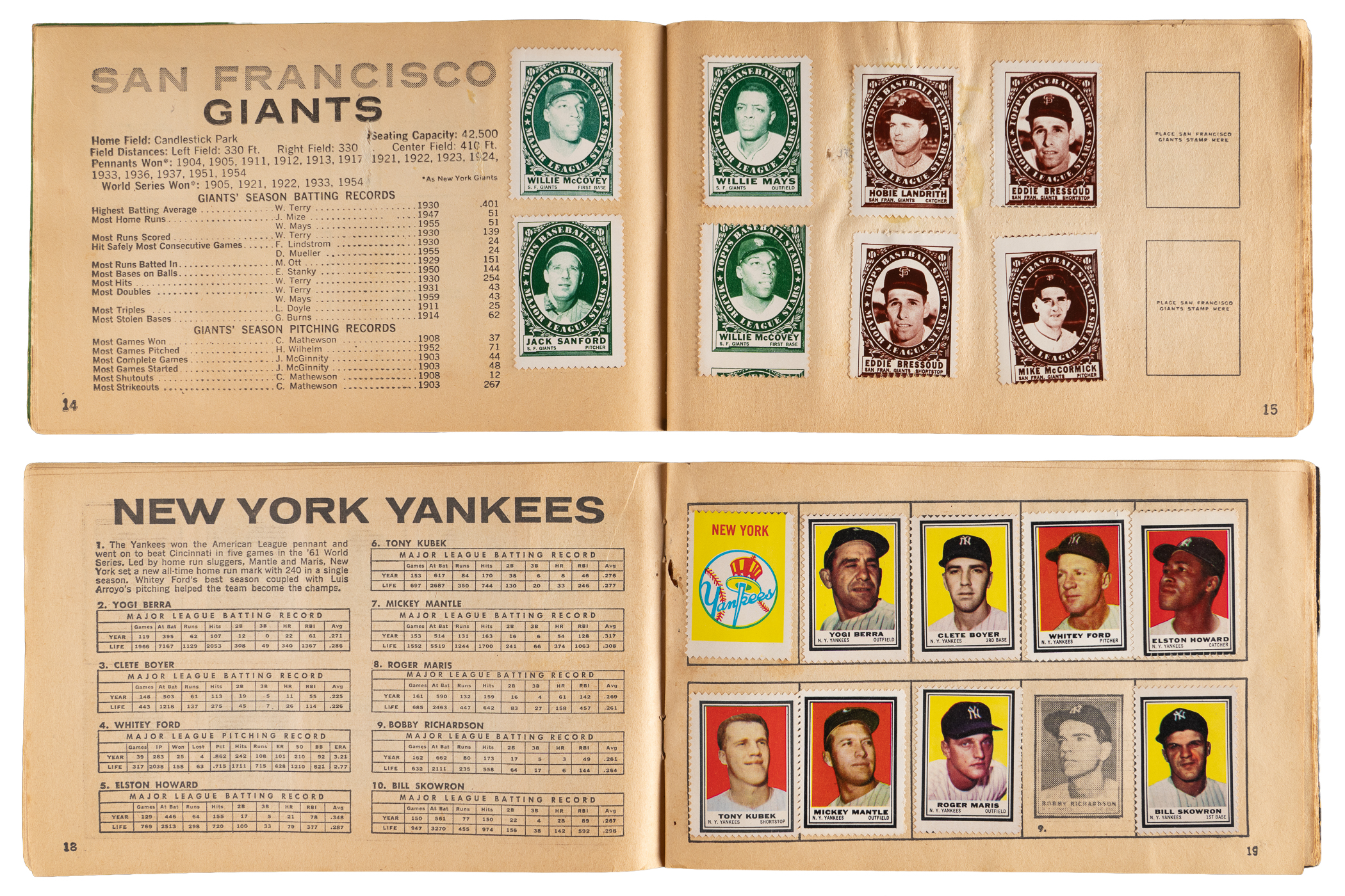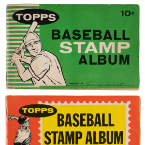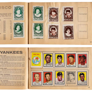 1961 Topps Stamps Album: (160 stamps, owner writing on front cover) with (2) Aaron, (3) Aparicio, (2) Berra, Bunning, Drysdale, Herzog, Kaat, (3) Kaline (two different versions), Killebrew, Mantle, (2) B. Martin, (3) Mathews, Mays, Mazeroski, (2) McCovey, Minoso, Musial, Spahn, B. Williams, Di. Williams, (3) Wynn, (2) Yastrzemski;
