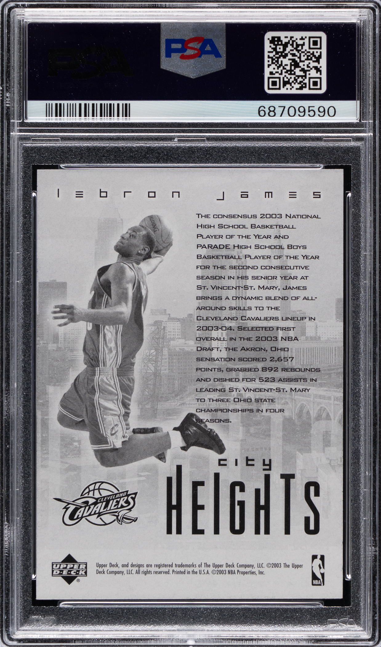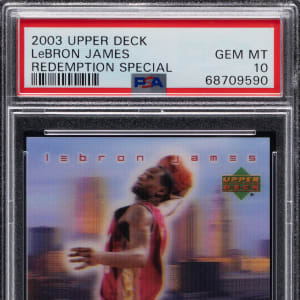 Graded GEM MINT 10 by PSA. Showcased is a 2003 Upper Deck LeBron James rookie redemption special. This City Heights 3-D card portrays the ageless wonder soaring through the stratosphere against a Cleveland cityscape.