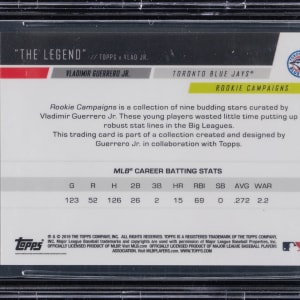 Signature judged Authentic by Beckett and encapsulated. Toronto Blue Jays superstar Vladimir Guerrero Jr. debuts on this signed 2019 Topps X "The Legend" #1 rookie card. The bold Sharpie autograph is neatly placed on a (NM-MT) surface.