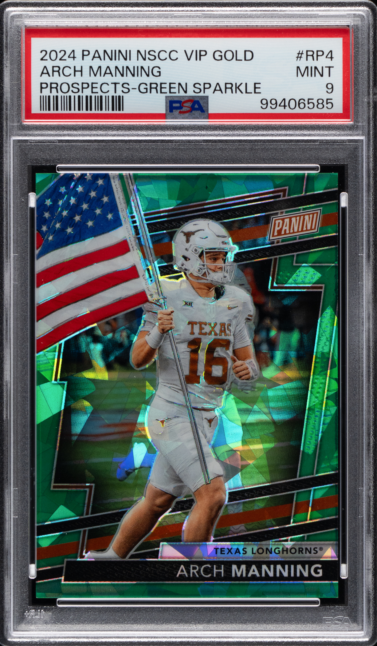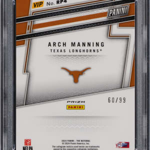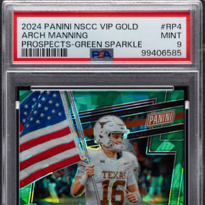 Serially numbered #/99. Graded MINT 9 by PSA. Prospectors will find substantial value with the offered 2024 Panini National Sports Card Convention VIP Gold Prospects #4 Arch Manning pre-rookie. This Texas Longhorns sensation and future NFL draft pick is a green sparkle variant.