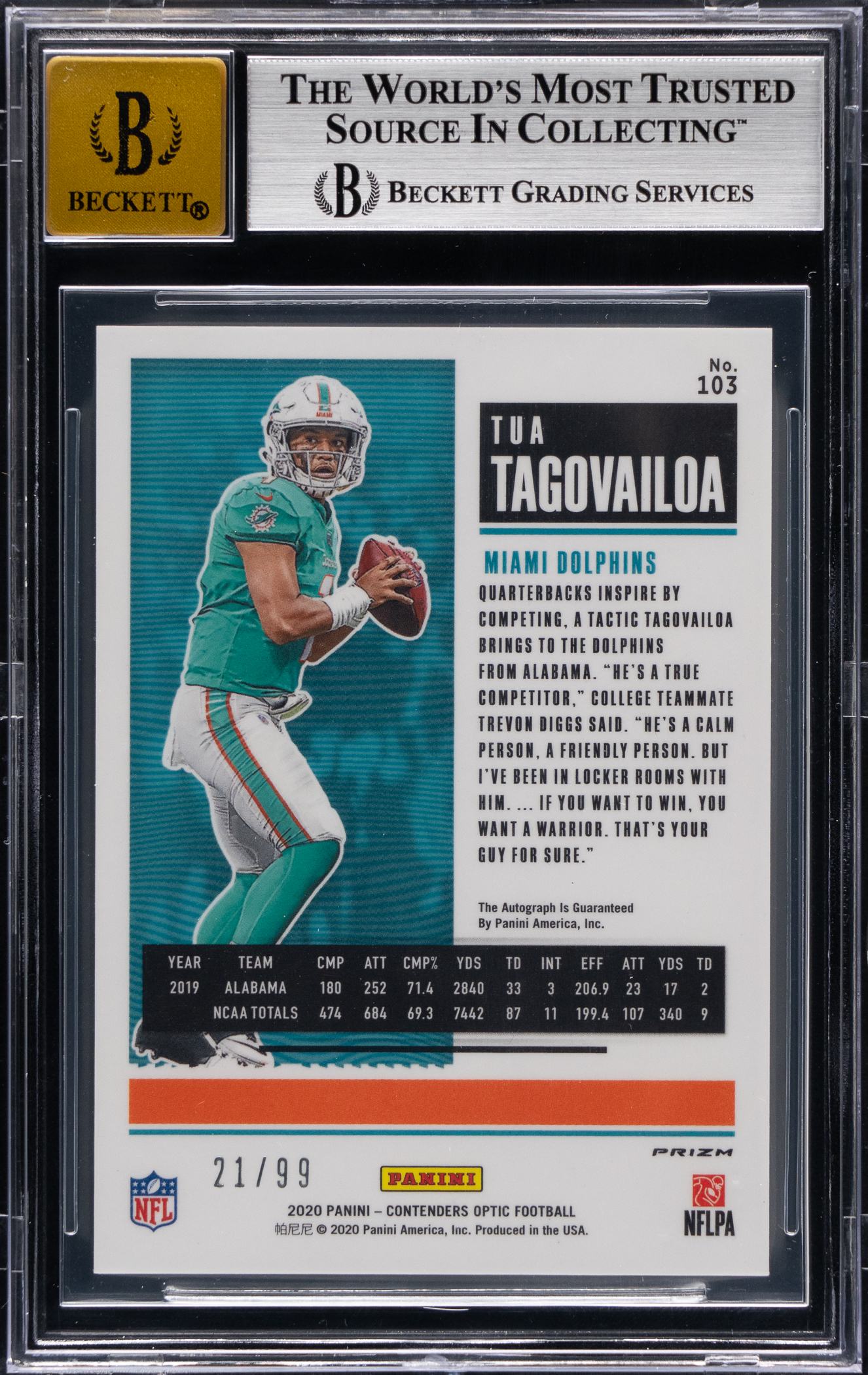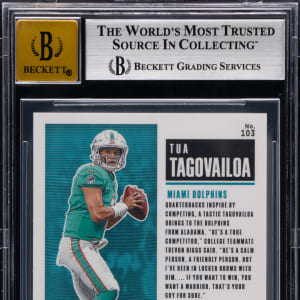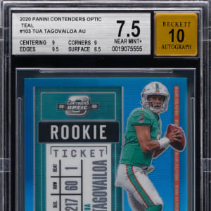Serially numbered #21/99. Graded NM+ 7.5 by BGS with a "10" Autograph grade. Presented is a 2020 Panini Contenders Optic Football #103 Tua Tagovailoa rookie certified autograph. This teal variant of the Miami Dolphins quarterbacks displays the following sub-grades: Centering: 9; Corners: 9; Edges: 9.5 and Surface: 6.5.