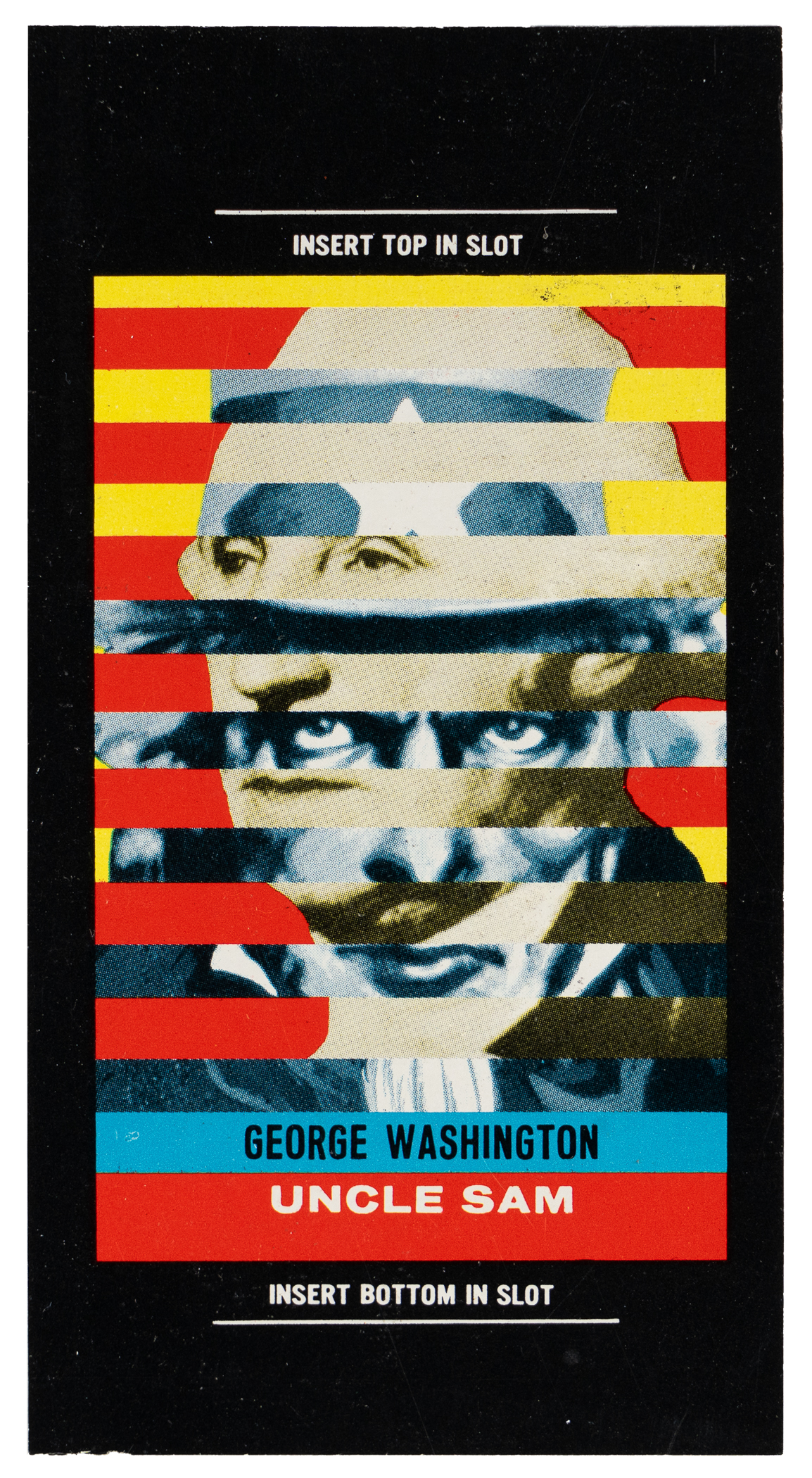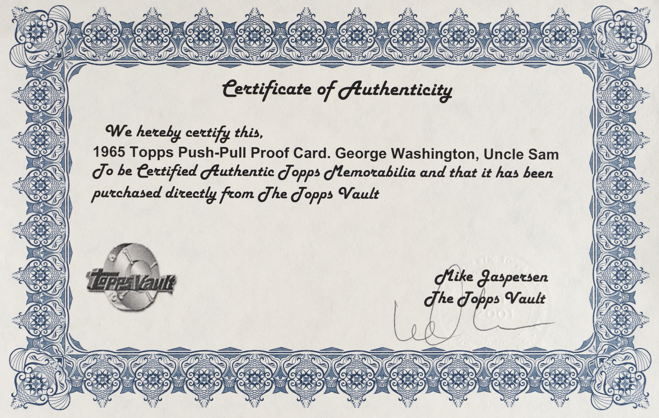A certified treasure from the Topps vault is presented, with this 1965 Push-Pull #4 George Washington/Uncle Sam proof card. Minor touches of wear in the form a light crease at top-right and a bit of white showing on the condition sensitive, black-bordered edge at bottom-left, limit the technical grade to Vg-Ex, though otherwise this vibrant, glossy card presents a good bit better.