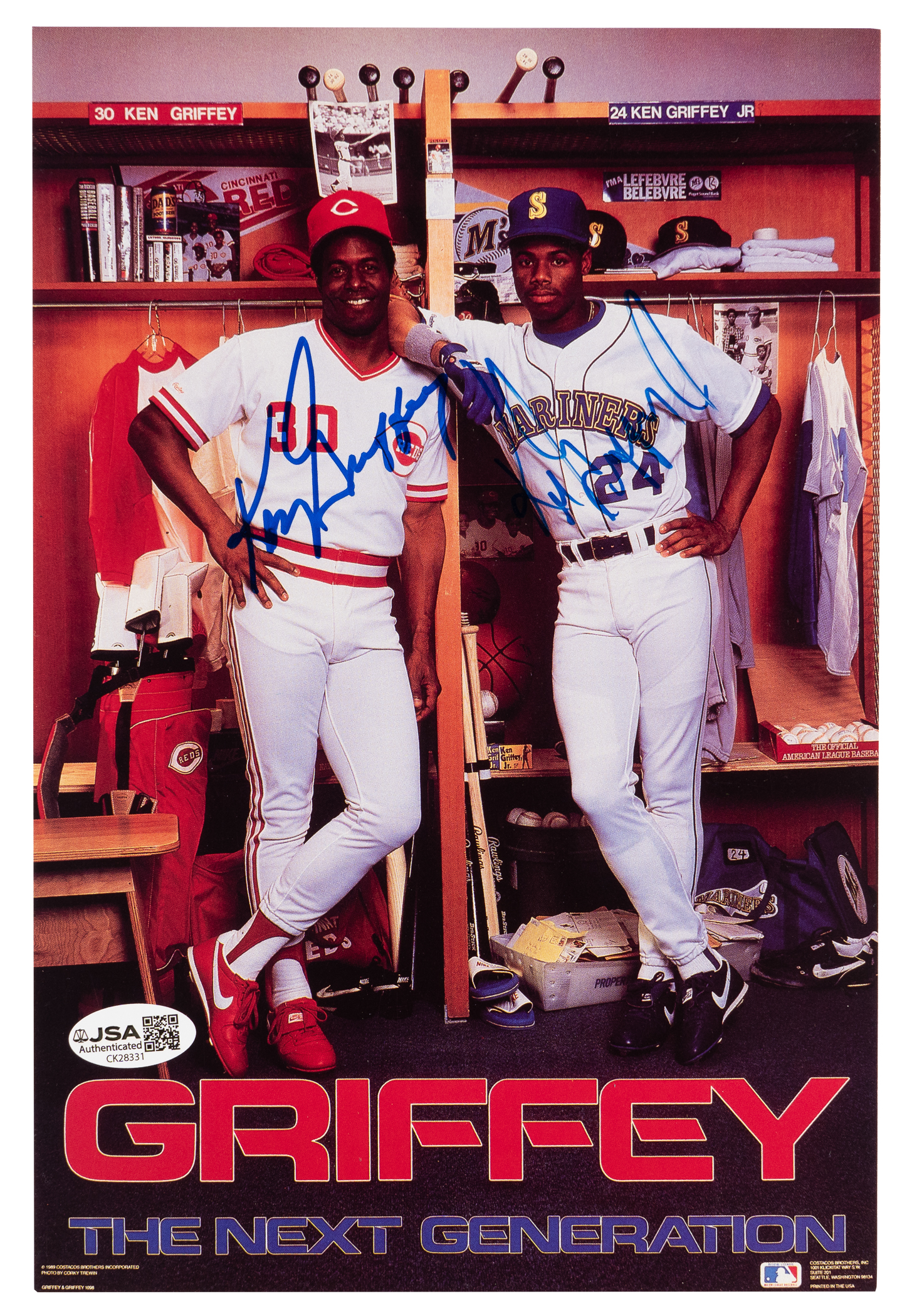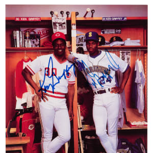"The Kid" and a cog of "The Big Red Machine"! Offered is a "Griffey: The Next Generation" promotion photo signed by both Ken Sr. and, Hall of Famer, Junior. The blue Sharpie autographs are penned over their respective torsos, with the Junior example being in the style of his early penmanship. The 7x10 inch photograph comes with JSA sticker and matching COA.