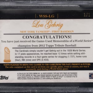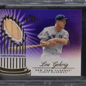 Graded GEM MINT 9.5 by BGS and serially numbered #1/1. Barrel up with the offered 2012 Topps Tribute Lou Gehrig game-used bat relic from the World Series Swatches subset. This purple variant of the New York Yankees Hall of Fame slugger showcases the following sub-grades: Centering: 9.5; Corners: 9.5; Edges: 9 and Surface: 9.5.
