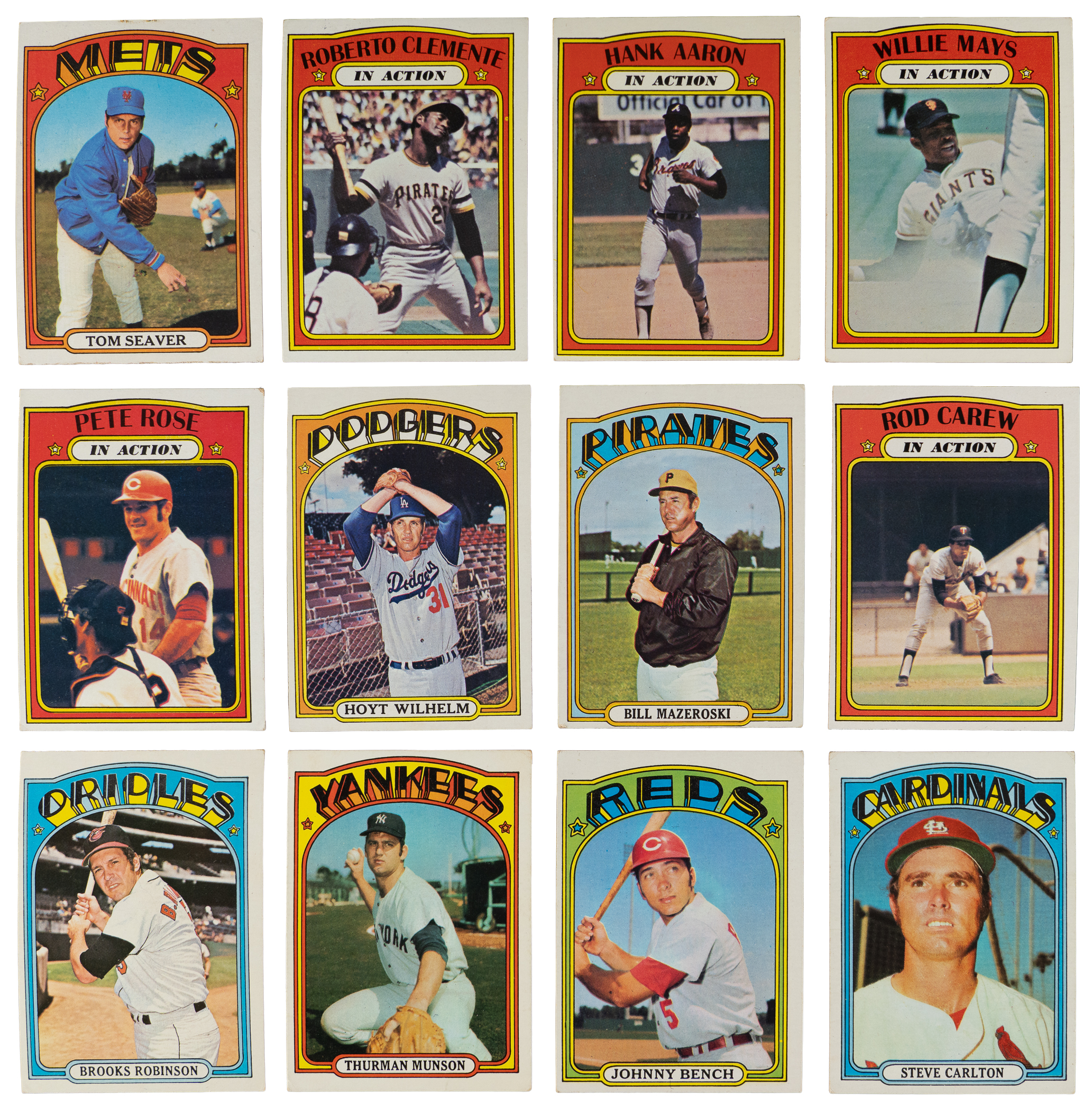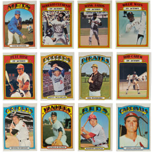 Prime 1972 Topps complete set of (787) cards. This “collector’s grade” assembly has an approximate condition breakdown of 15% (EX-MT or better), 20% (EX), 35% (VG-EX) and 30% (VG or lesser) with the challenging high series generally presenting on level with the more available numbers. Highlights include: #37 Yastrzemski (EX), #49 Mays (VG), #50 Mays IA (VG-EX), #79 Fisk/Cooper RC (VG), #130 Gibson (VG), #299 Aaron (VG), #300 Aaron IA (VG-EX), #309 Clemente (VG-EX), #310 Clemente IA (VG-EX), #420 Carlton (GD), #433 Bench (VG-EX), #435 R. Jackson (EX), #441 Munson (GD), #445 Seaver (VG-EX), #550 B. Robinson (VG-EX), #559 Rose (VG-EX), #560 Rose IA (VG-EX), #595 Ryan (VG), #600 Kaline (VG-EX), #686 Garvey (VG), #695 Carew (VG-EX), #696 Carew IA (VG), #751 Carlton TRD (GD), #752 Morgan TRD (VG), #754 F. Robinson TRD (GD), #760 Mazeroski (VG), #761 Oglivie/Cey RC (VG-EX) and #777 Wilhelm (VG-EX).