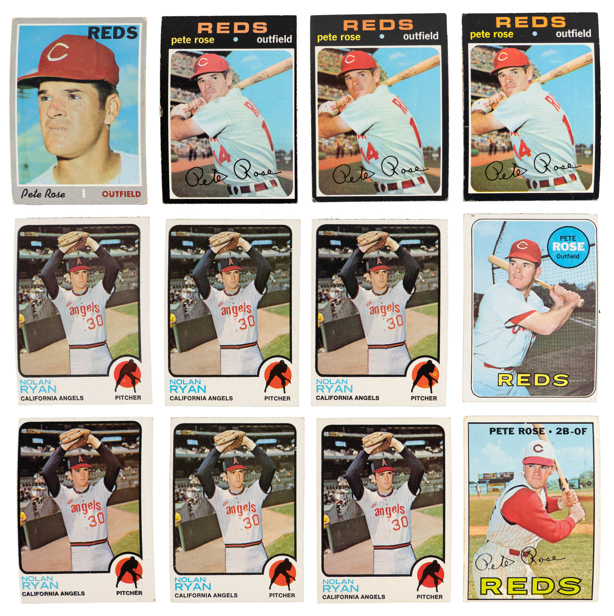 Pete Rose: (110 cards) with 1967 Topps #430 (GD), 1969 Topps #120 (GD), 1970 Topps #580 (GD), 1970 Topps Story Booklets #15 (EX-MT), (3) 1971 Topps #100 ((2) VG-EX, GD), 1972 Topps #560 IA (EX), (2) 1973 Topps #130 (EX-MT, VG-EX), (2) 1974 Topps #300 (EX, FR), 1975 Topps #320 (EX-MT), (3) 1977 Topps #450 (EX, VG-EX, VG), 1977 Topps Cloth Stickers #38 (NM), (28) 1986 Topps #1 (average NM);