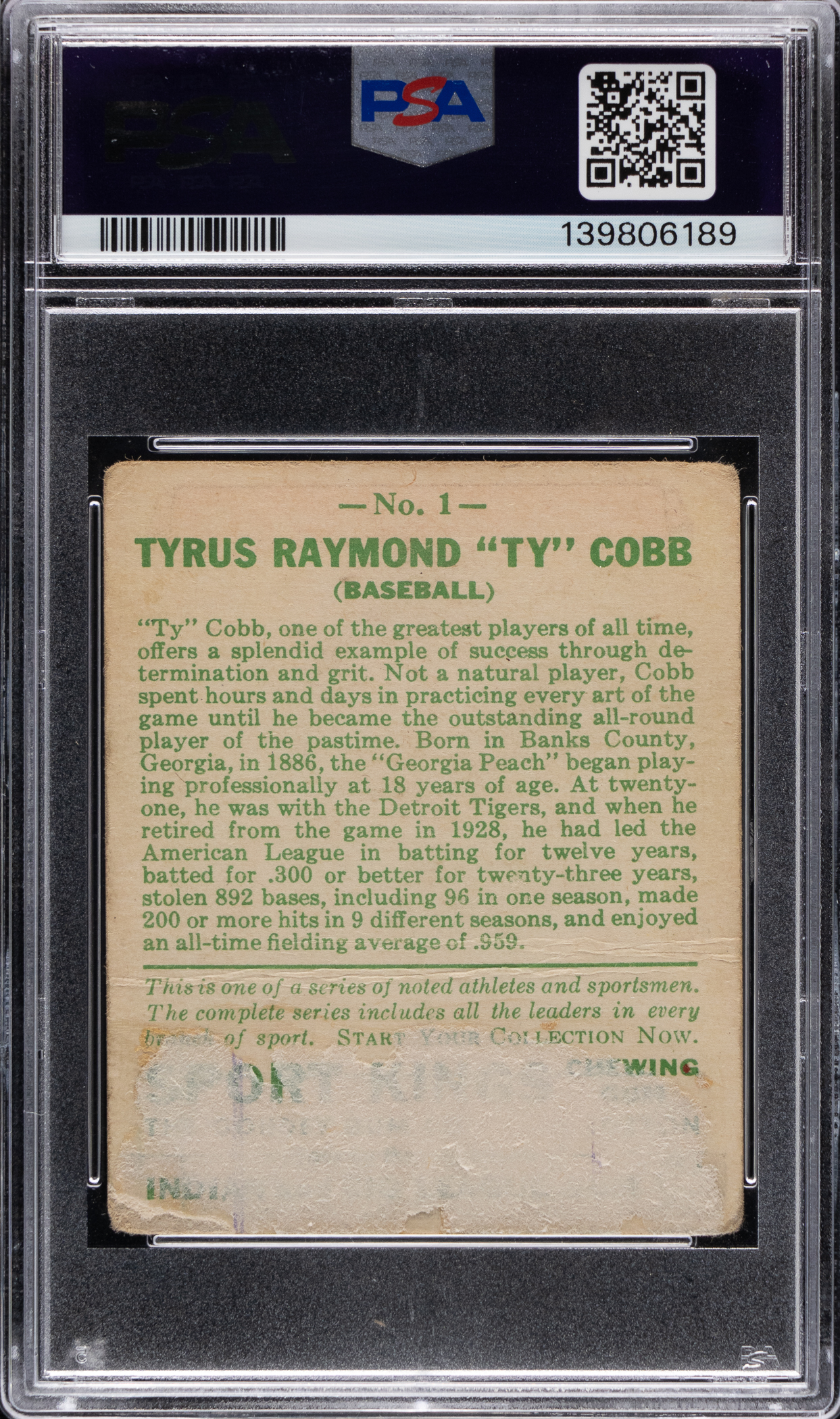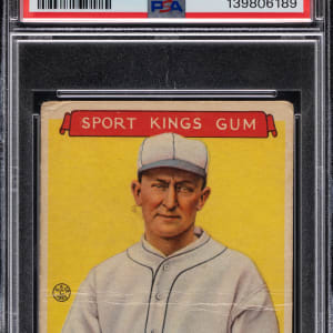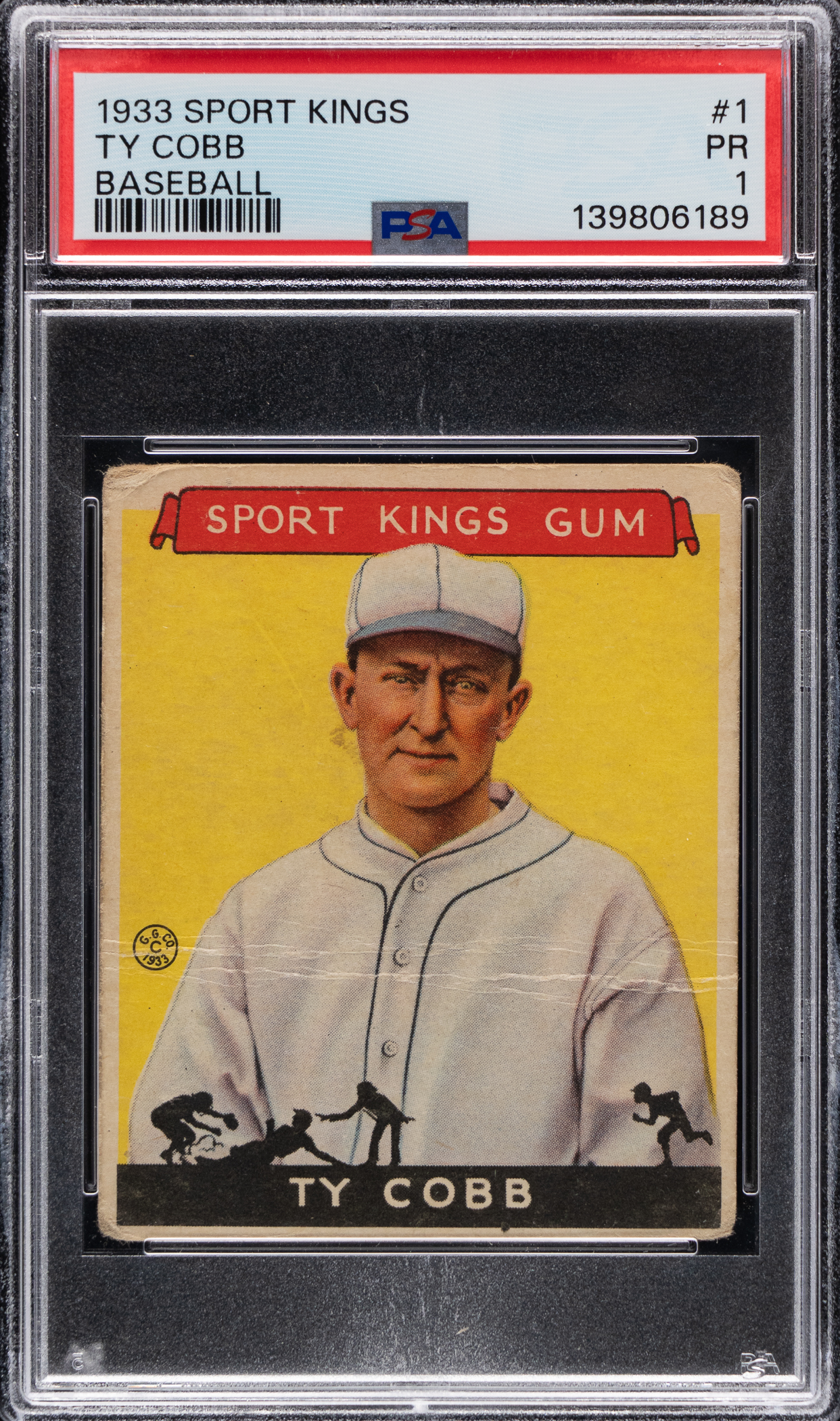 Graded POOR 1 by PSA. Ty Cobb casts an intimidating glare on his 1933 Sport Kings Gum #1 single. Although this stack topper displays significant horizontal creasing, handling, and reverse paper residue, this gum card of "one of the greatest players of all time" still boasts fine eye appeal.