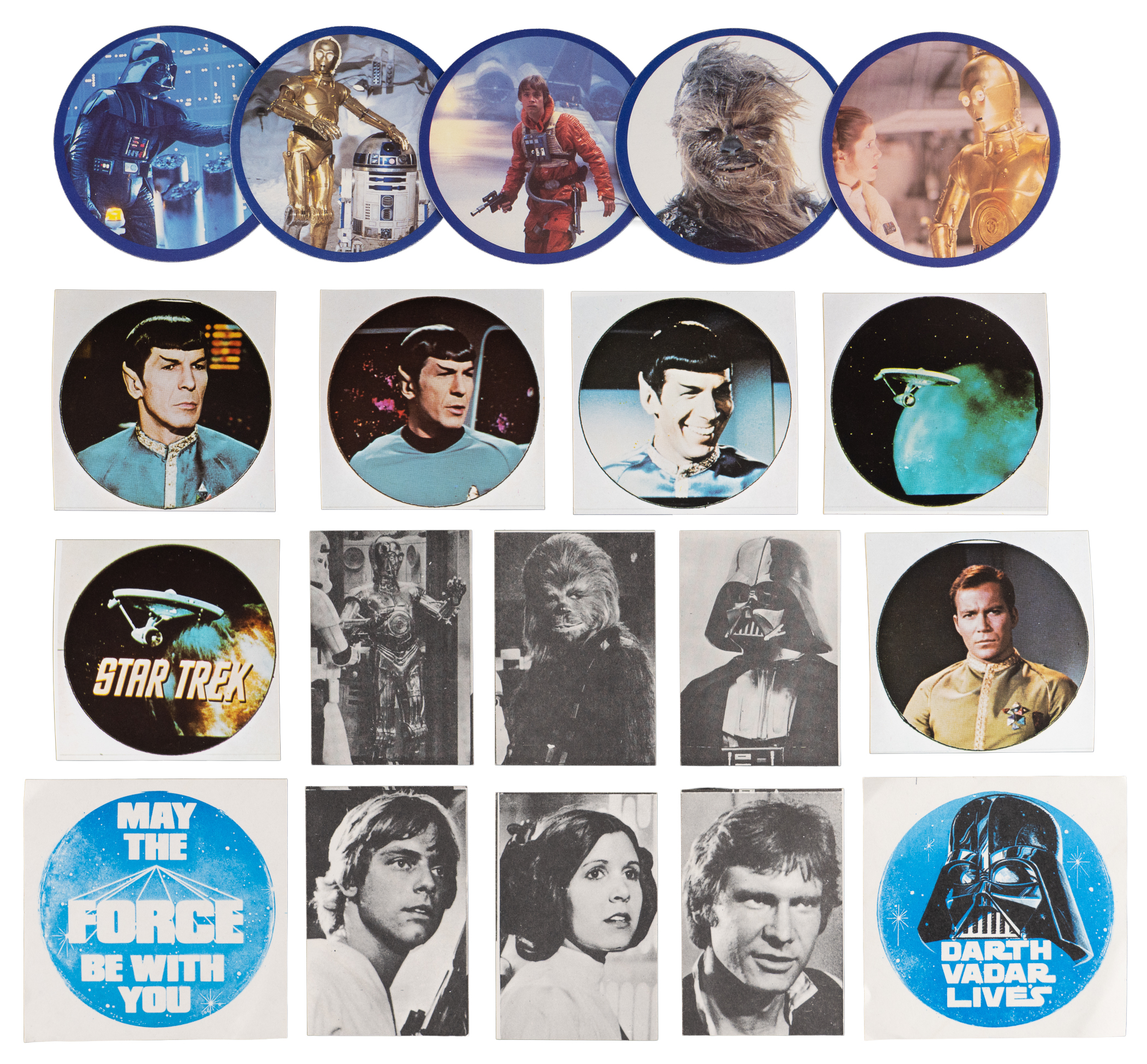 Circa 1977 Fasson Crack 'N Peel Star Wars sticker complete set (8), with (6) black and white photo stickers average Nm: Darth Vader, Luke, Leia, Han, Chewbacca, C3PO; and (2) color slogan stickers average Ex+: “Darth Vader Lives”, “May the Force Be With You”;