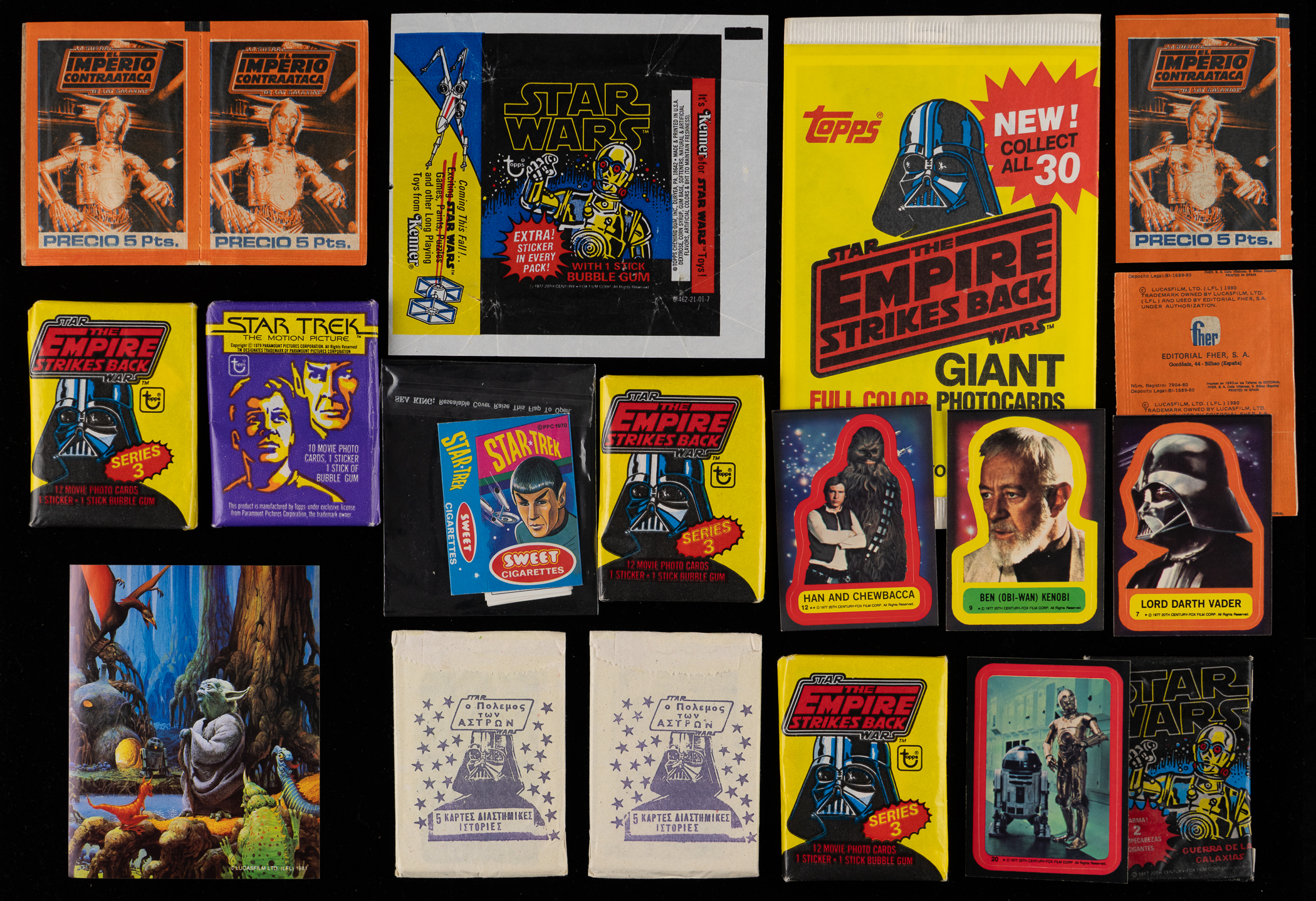 Star Wars ESB Greek language: sealed packs (10) average Ex to Ex-Mt, loose cards (300+) average Ex to Nm+, paper wrappers (60+) average Vg to Vg-Ex, and retail box with detached lid;