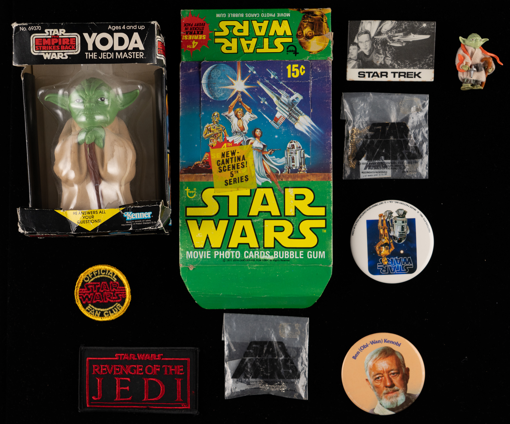 Miscellaneous better grade to like-new items: binder with (30+) SW/ST 8” x 10” photographs and assorted ephemera; 1990s Star Trek cards (15) with Kirk bloody shirt, and scarce numbers 179, 193, 208, 224, 237; Star Trek 1990s hologram cards (3) with Starship Enterprise; Star Wars 4x6 art stickers (14); Star Wars pins (3); Star Trek pins; Star Wars patches (2); Star Wars necklaces with charms (2) in original bags, with Darth Vader and C3PO; 1980 Star Wars ESB Yoda action figure with accessories; 1978 American Premium Corp Star Wars cards (18) average Nm, with branded album; GAF View-Master Star Trek TOS set with envelope split on two sides; Sweet Cigarettes Star Trek cards (12) and box, Nm-Mt to Mt; Star Trek Sky Motion cards (2) with sleeves.