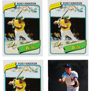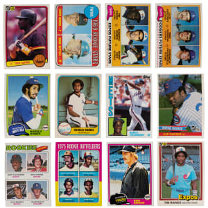 1980s-1990s Stars: (111 stars, average NM to NM-MT) with (3) 1980 Topps #482 Henderson RC (NM, (2) EX-MT), 1981 Donruss #538 Raines RC (NM-MT), 1981 Fleer #346 Baines RC (NM), 1981 O-Pee-Chee #136 Raines RC (NM), 1981 Topps: #302 Valenzuela RC (EX-MT), #315 K. Gibson RC (EX), #347 Baines RC (EX-MT), (2) #49 Raines RC (both NM); 1983 Donruss #598 Gwynn RC (EX-MT), 1984 Donruss #41 J. Carter RC (EX-MT), 1984 Topps #182 Strawberry (EX-MT), 1985 Topps: #181 Clemens RC (NM), (3) #536 Puckett RC (all EX-MT); 1987 Donruss: (3) #36 Maddux RC (Mint, (2) NM-MT), (10) #361 Bonds RC (average NM-MT); (2) 1987 Fleer #604 Bonds RC (NM, EX-MT), (11) 1987 Topps #320 Bonds RC (average NM-MT), (3) 1989 Fleer #548 Griffey Jr. RC (NM-MT, (2) NM), 1989 Topps Traded #41T Griffey Jr. RC (NM-MT), 1993 SP #279 Jeter RC (EX-MT)