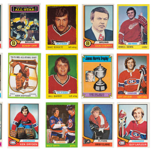 Power play of 1973-1974 and 1974-1975 Topps Hockey complete sets. Highlights include: 1973-1974 Topps set: (176/176, average EX-MT to NM) with #10 Dryden (EX), #17 Dionne (EX-MT), #70 Perreault (EX-MT), #72 LaFleur (EX-MT), #81 Barber RC (NM), #149 Schultz RC (EX-MT), #150 Orr (EX-MT), #162 B. Smith RC (EX); 1974-75 Topps set: (264/264, average EX-MT) with #100 Orr (EX-MT), #130 Orr AS (EX-MT), #155 Dryden (EX), #161 Cherry RC CO (EX-MT), #168 McDonald RC (EX), #180 Salming RC (EX-MT), #195 D. Potvin RC (EX), #232 LaFleur (VG-EX), #248 Orr/Norris Trophy (EX), #260 Clarke (EX) and #261 Bowman RC CO (EX).