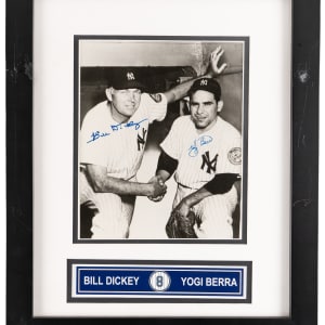 New York Yankees Hall of Fame catchers Yogi Berra and Bill Dickey are seen shaking hands on this classic 8x10 black and white photograph. Famous #8s with their number jointly retired by the New York club, each backstop has boldly signed the photograph which has been matted and framed to overall dimensions of 14x17. JSA COA affixed to the frame-back.