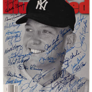 Hail, hail, the gang's all here, with this 1940s-1970s New York Yankees alumni multi-signed Sports Illustrated magazine. Fronting this August 21, 1995 SI issue, is a photograph of a smiling Mickey Mantle, taking during his younger days. Mantle had passed away a week before this issue hit the newsstands, and a well-deserved tribute is found within. A grand total of (30) Yankees alumni, many of whom were Mantle's teammates, have decorated the front cover with sharp signatures.