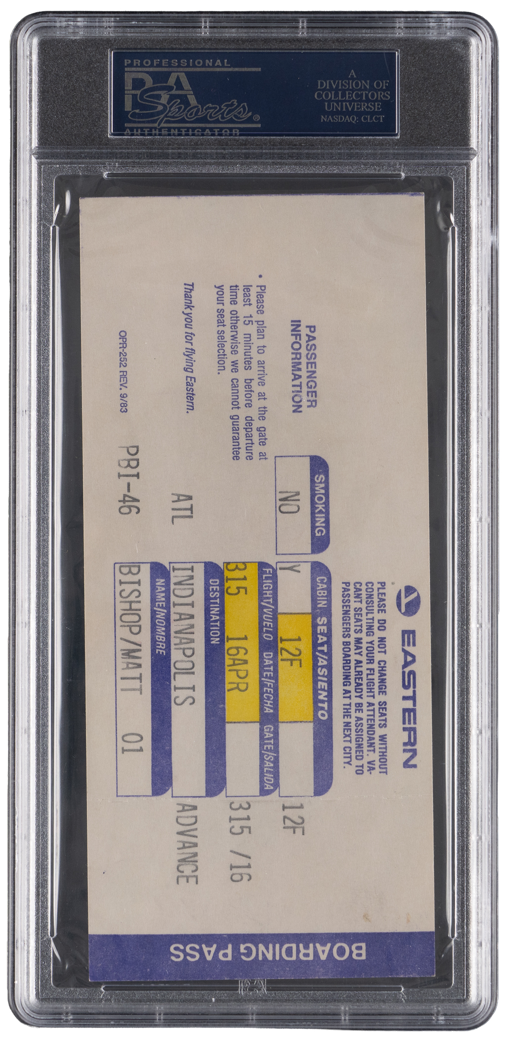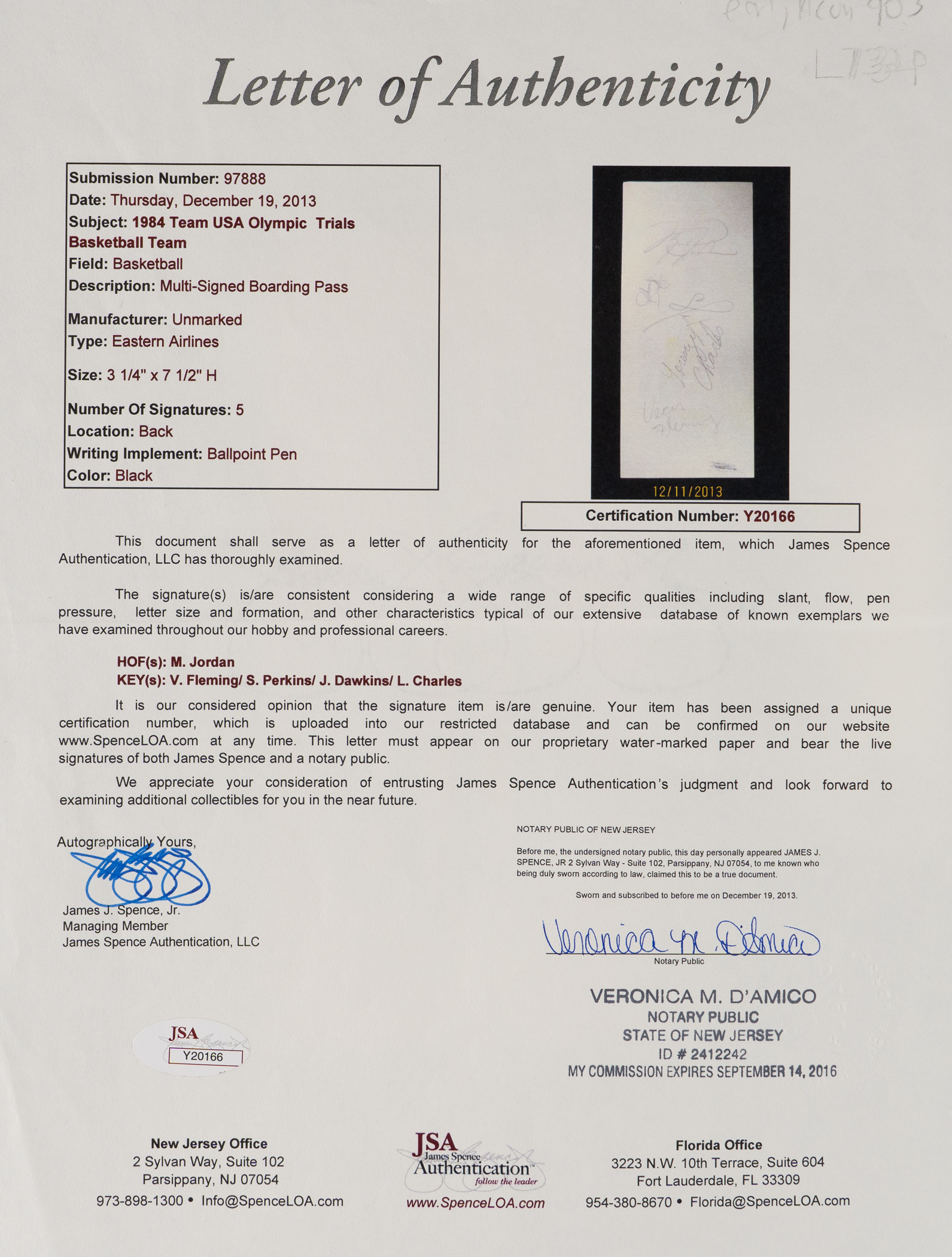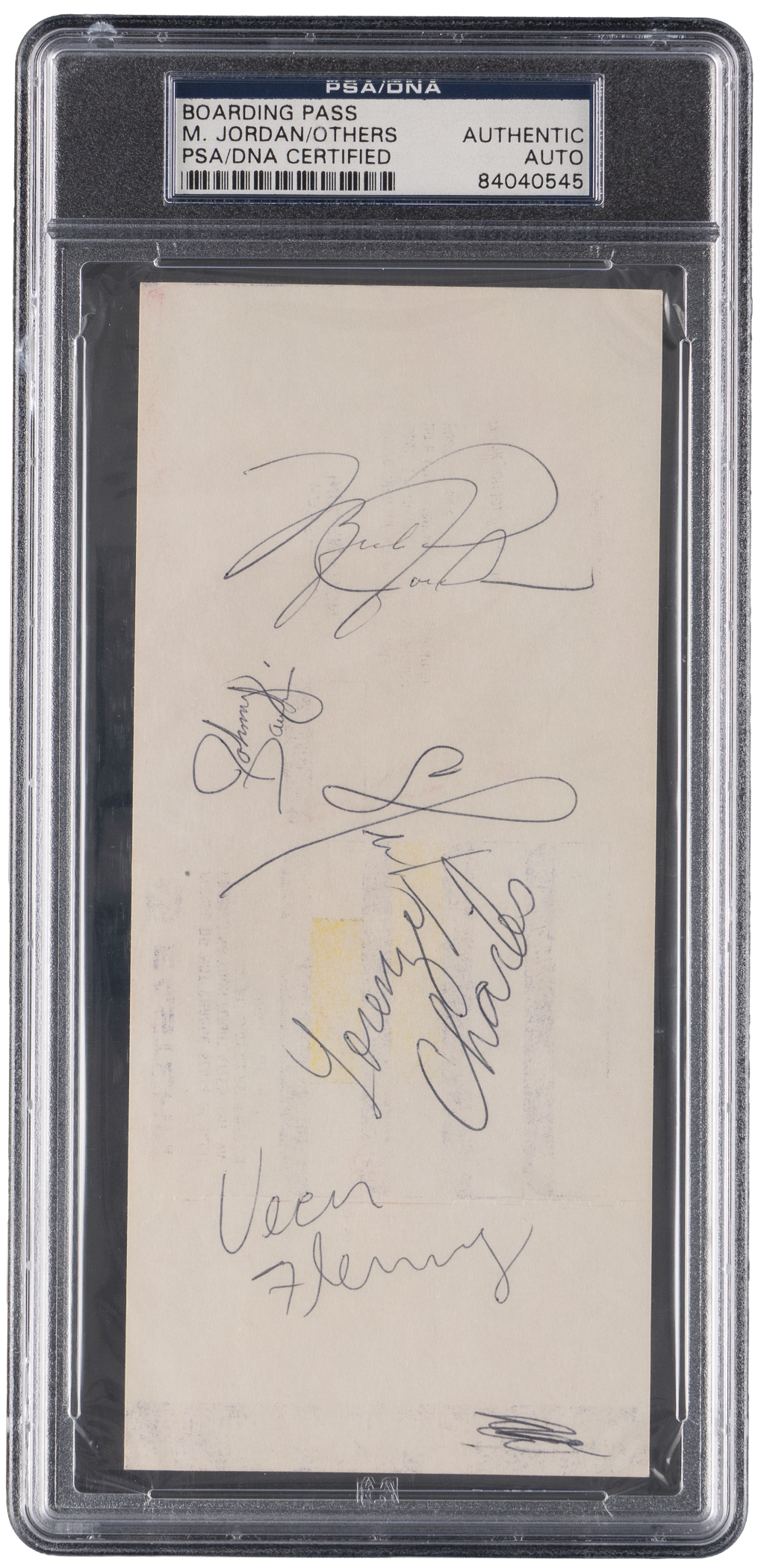 Olympic hopefuls are collected with this 1984 Team USA basketball trials multi-signed boarding pass. This period-signed pass was good for a seat on Eastern Airlines 4/16/84 Flight 315 to Indianapolis, as printed on the obverse. Located on the reverse are (5) distinct signatures, including three stars who made the gold medal-winning 1984 Team USA squad, and two players who were cut during the trials by head coach Bobby Knight. Featured subjects are: Team USA members Michael Jordan (HOF), Sam Perkins, and Vern Fleming; and cut players Johnny Dawkins, and Lorenzo Charles. Seventy players attended the trials, which were held on Knight's home turf at Indiana University Bloomington, and the date of the nicely preserved boarding is consistent with the April trials. The 1984 Los Angeles Summer Olympics introduced Jordan to a worldwide audience, and his pre-NBA signature on this twice-certified boarding pass is a great historic treasure.