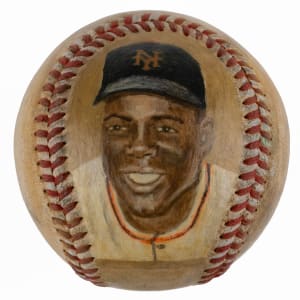 All-time great Willie Mays is immortalized in art, with this hand-painted baseball by Gary Guerra. Mays is all smile in this reverent rendering, which depicts him during his early days with the New York Giants. Though there's some minor crazing on the left shoulder, a clear protective coating has performed admirably in preserving this handsome portrait, which radiates display appeal. The ball is significantly toned to a warm tan shade, and little remains of the factory labeling stamps. Artist Guerra has signed on the panel opposite the Mays portrait.