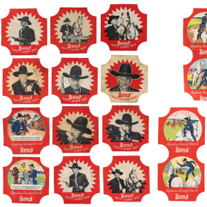 Fictional cowboy hero Hopalong Cassidy rides the open frontier with the offered 1950s Bond Bread Labels collection featuring multiple sets, dupes and a trio of clean albums. This rootin’ tootin’ gallery is highlighted by the following: