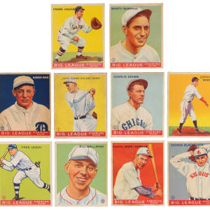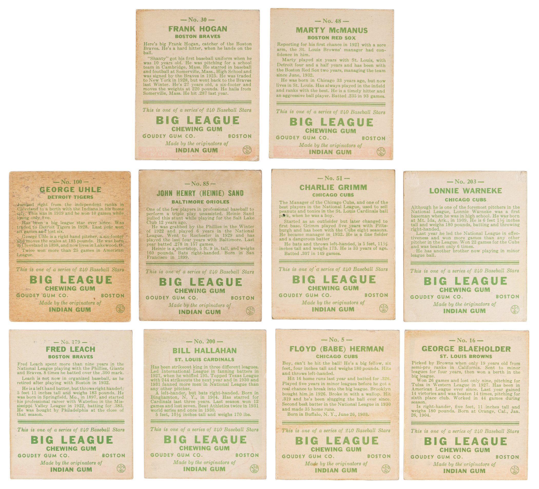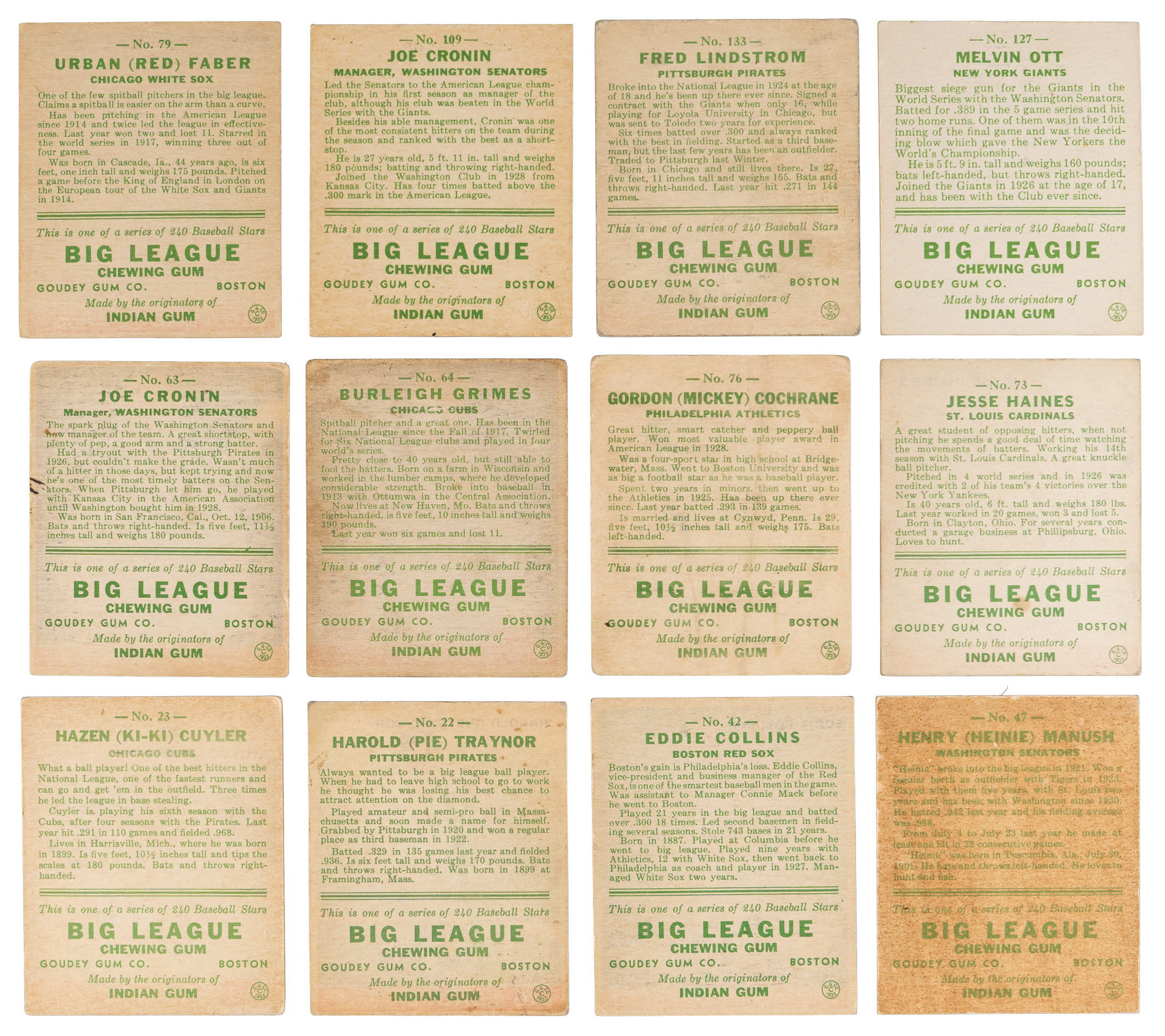A fine collection of (22) 1933 Goudey singles hallmarked by a dozen Hall of Famers. This "Big League Chewing Gum" collection includes the following: Hall of Famers: (12 cards) with #22 Traynor (trimmed), #23 Cuyler (FR, erased writing), #42 E. Collins (VG-EX), #47 Manush (VG), #63 Cronin (trimmed), #64 Grimes (trimmed), #73 Haines (trimmed), #76 Cochrane (GD), #79 Faber (trimmed), #109 Cronin (trimmed), #133 Lindstrom (VG), #137 Ott (trimmed); Others: (10 cards, average VG to VG-EX with 17% reverse paper loss or trimmed) with #5 B. Herman (trimmed), 16, 30, 48, 51, 85, 100, 179, 200 and 203.