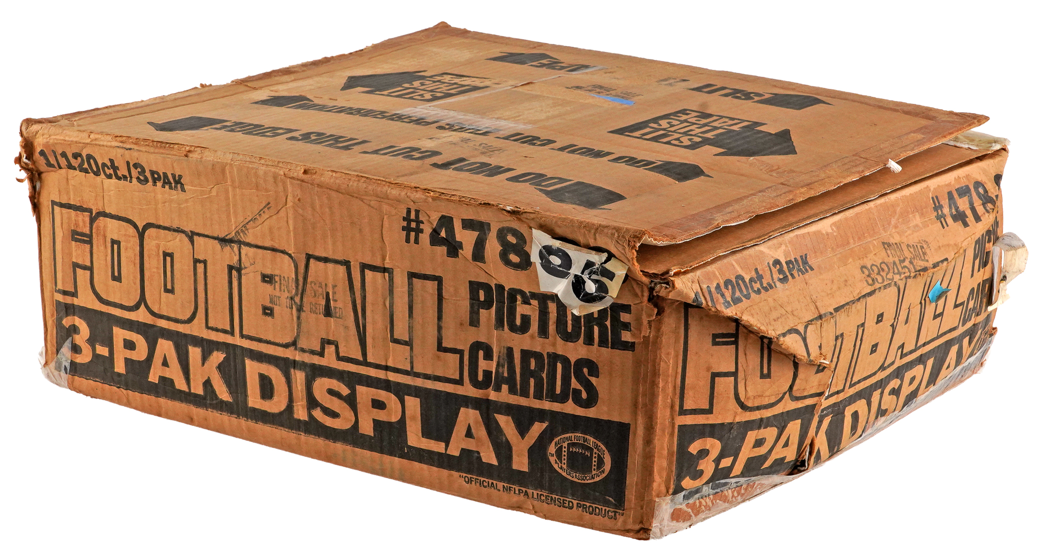 A gridiron bonanza of (24) 1985 Topps Football grocery rack packs. Each storefront survivor will yield 42 cards plus three sticks of bubble gum. From this condition-sensitive edition, mine high-grade gems of Elway (second-year), Marino (second-year), Moon RC and many more! It is unknown which players are found on the fronts/backs. Interestingly, the original "final sale not to be returned" display (with instructions) is included. Despite written notations and the original vendor stamp, this piece is still ready-to-be-assembled for the first time. These bundles of (12) racks each come individually shrink-wrapped by Baseball Card Exchange (owned by Steve Hart, the foremost expert on unopened material). The size/weight of this item requires that there will be an additional shipping charge for this lot.