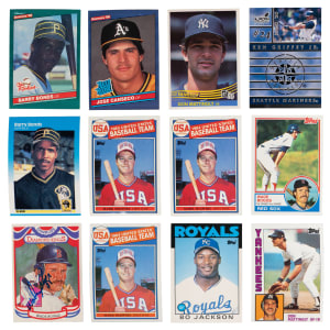 1980s-2000s Singles: (9,000+ cards, average NM to NM-MT throughout) with 1983 Topps #498 Boggs RC, 1984 Donruss: signed #26 Boggs Diamond Kings (Auction LOA from James Spence/JSA), #248 Mattingly RC; (2) 1985 Topps #401 McGwire RC, (10) 1987 Leaf #46 McGwire, 1991 Topps East Coast National Mantle, 1999 Pacific Aurora #17 Griffey Jr. On Deck, (3) 2000 Fleer Feel The Game Game-Used Bats: Bonds, V. Guerrero, F. Thomas; 2001 Donruss Jersey Kings #10 O. Smith, (20-25) miscellaneous small sets and several unopened promo packs including 1986 Donruss Rookies (opened factory) and 1986 Sportflics Rookies (factory);