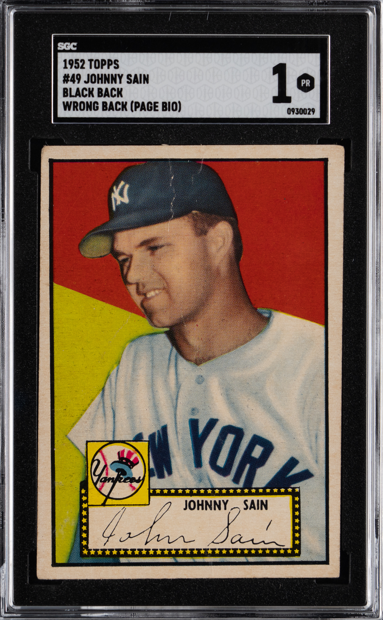 Graded POOR 1 by SGC. A factory mishap created an intriguing error card on the offered 1952 Topps #49 Johnny Sain single. It must have been confusing for young collectors to read Joe Page's biography/statistics underneath Sains' name. A clean example that will be of interest to master set collectors.