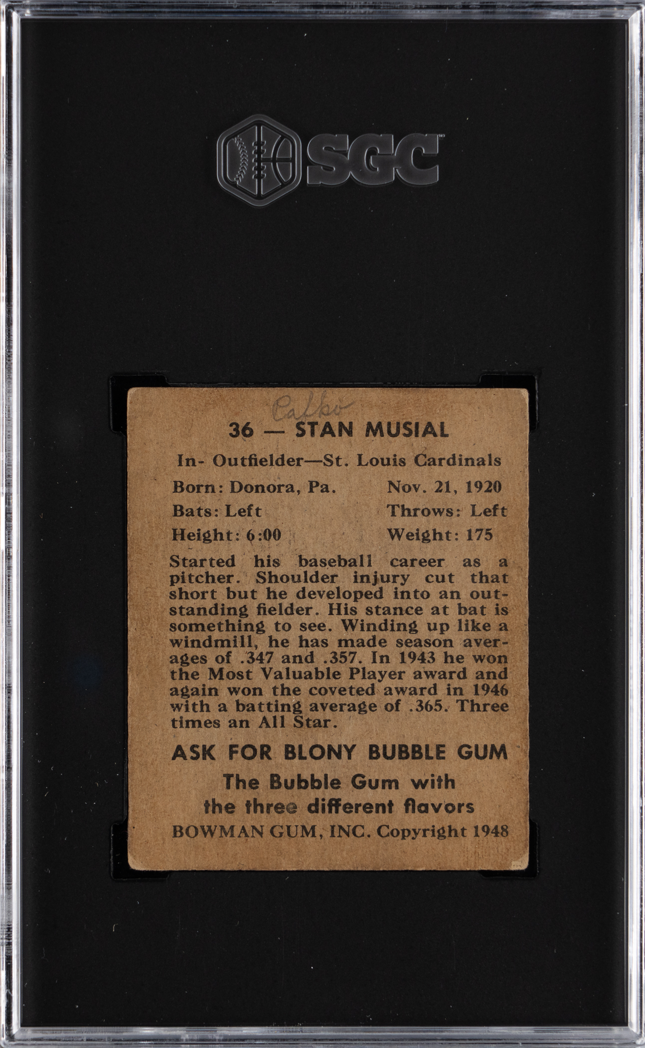 Graded FAIR 1.5 by SGC. The premiere of St. Louis Cardinals Hall of Fame slugger Stan Musial. With exception to pencil writing on back, this gum card otherwise presents as a mid-grade example.