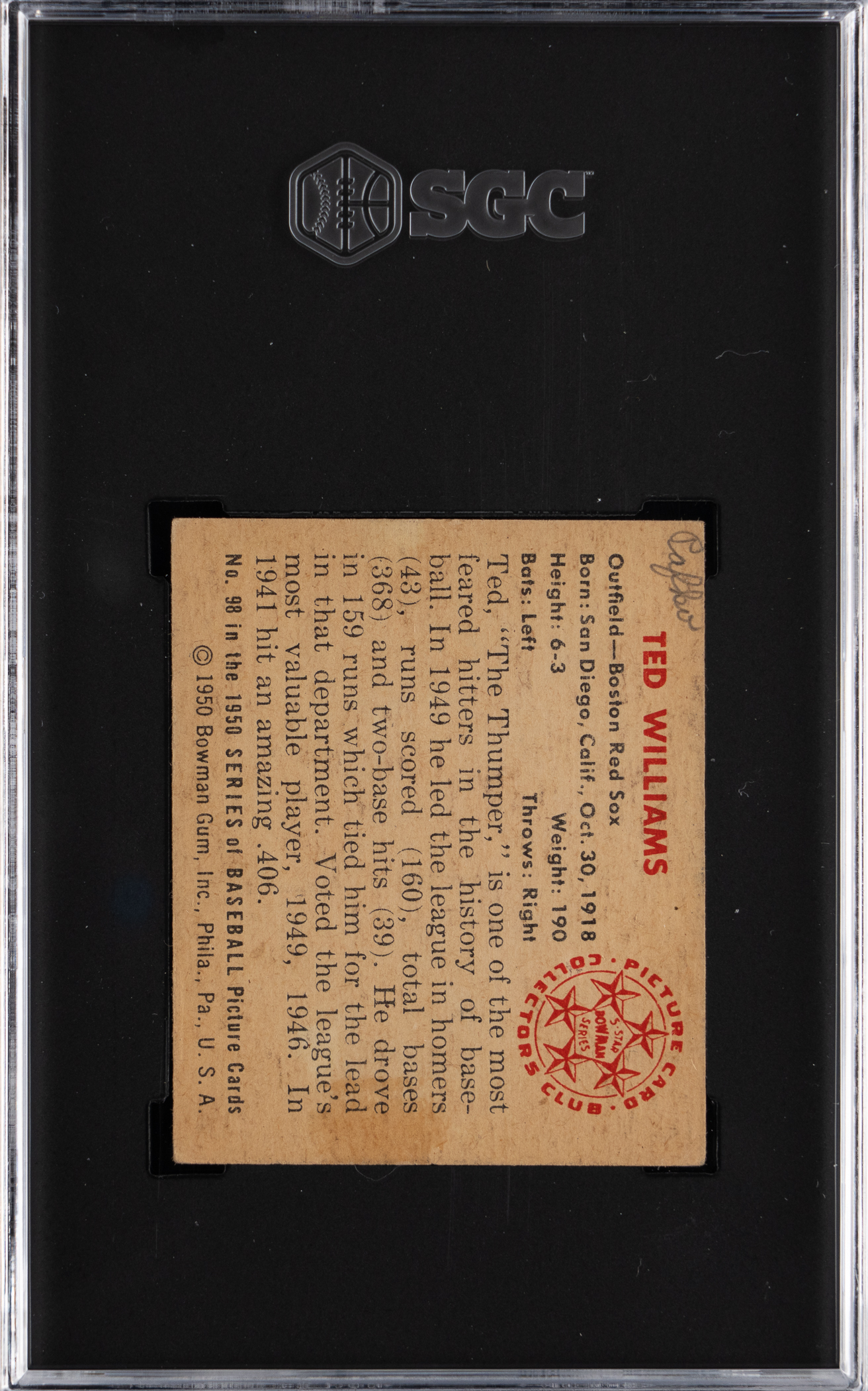 Graded FAIR 1.5 by SGC. "The Splendid Splinter" goes deep on the offered 1950 Bowman #98 Ted William gum card. With exception to pencil writing on back, this Boston Red Sox Hall of Famer otherwise presents as a mid-grade example.