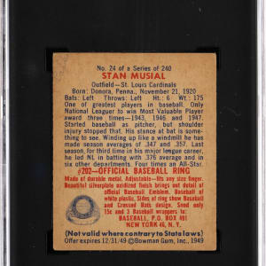 Graded FAIR 1.5 by SGC. Pick up the offered 1949 Bowman #24 Stan Musial gum card. With exception to pencil writing on back, this St. Louis Cardinals Hall of Famer otherwise presents as a mid-grade example.