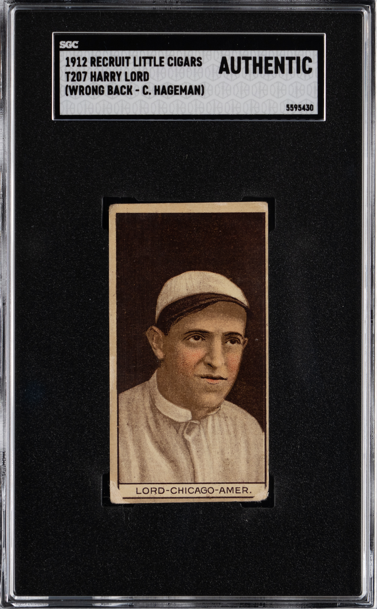 Graded Authentic by SGC. Tough 1912 T207 Brown Background picturing Chicago White Sox player Harry Lord on the front with the upside down statistics of Casey Hageman on the flip. With deference to the printing mishap, this error otherwise presents in (GD) condition with moderate corner/edge wear and a left edge crease tracing to Lord's right cheek.