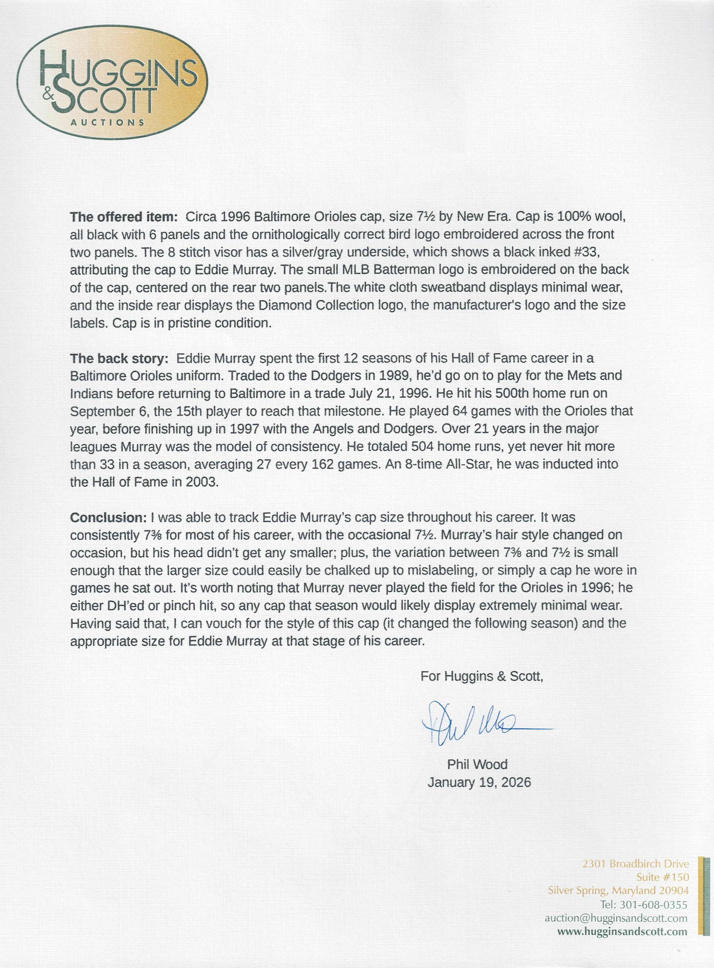 A proud bird comes home to roost, with this 1996 Eddie Murray attributed game-used Baltimore Orioles cap. Described on the accompanying LOA as pristine, this cap dates from the Hall of Famer's second stint with the Orioles, when he belted 10 home runs in 64 games as the team's designated hitter. As he was a DH in 1996, it's natural that this gamer shows minimal wear. Murray's blast on September 6th was his historic milestone home run #500, that made him the third player ever to rack up both 500 homers and 3,000 hits.