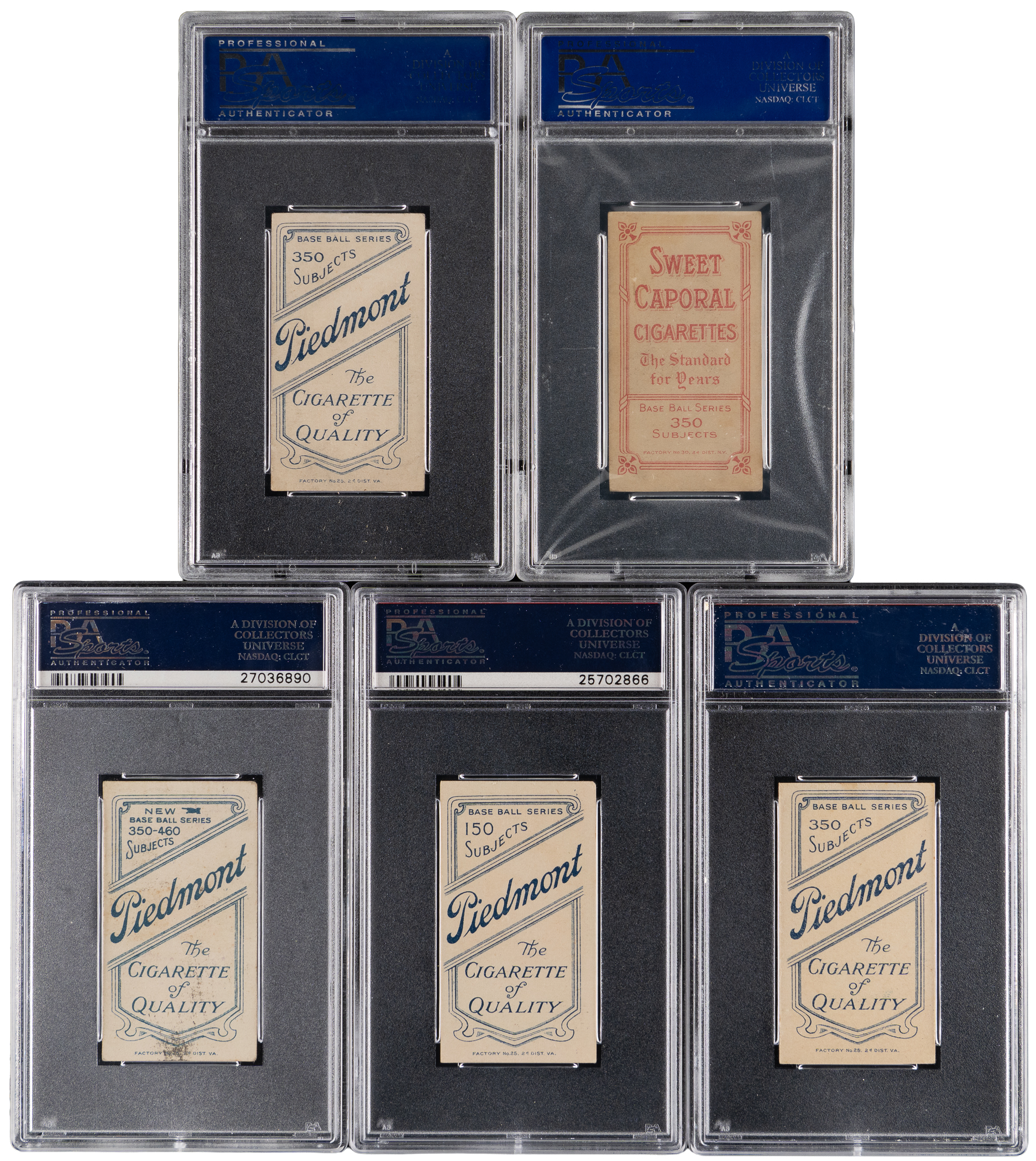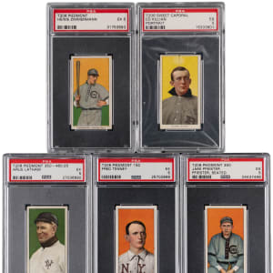 Each graded EX 5 by PSA with common advertising backs. Handsome arrangement of (5) 1909-1911 T206 White Border examples. Subjects include: Killian (Portrait), Latham, Pfiester (Seated), Tenney and Zimmermann.