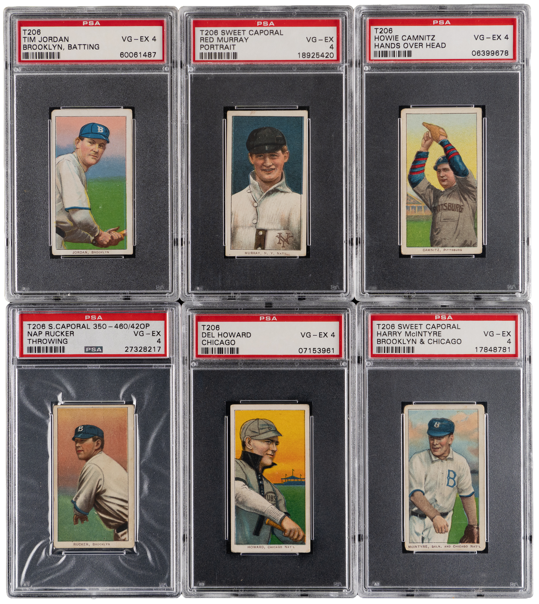 Each graded VG-EX 4 by PSA with Sweet Caporal advertising backs. Choice selection of (12) different 1909-1911 T206 White Border tobacco cards. Subjects include: Camnitz (Hands Over Head), Cree, Ferguson, D. Howard, T. Jordan (Batting), Krause (Pitching), H. McIntyre (Brooklyn & Chicago), Murray (Portrait), Owen, Quinn, Rucker (Throwing) and Summer.