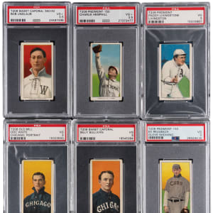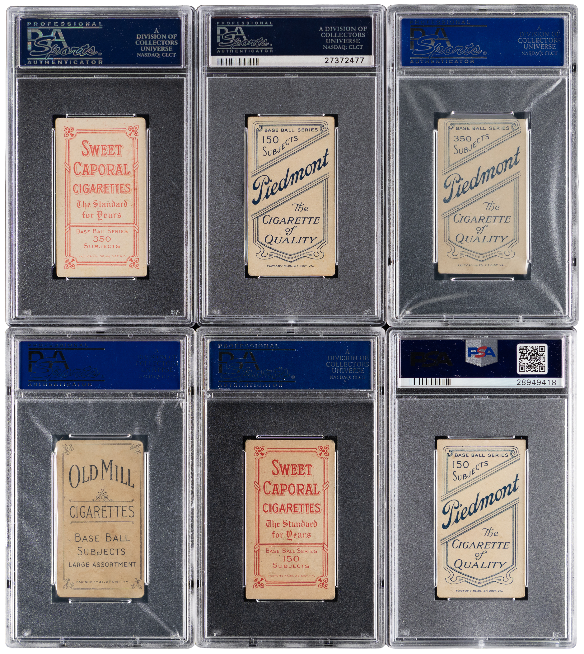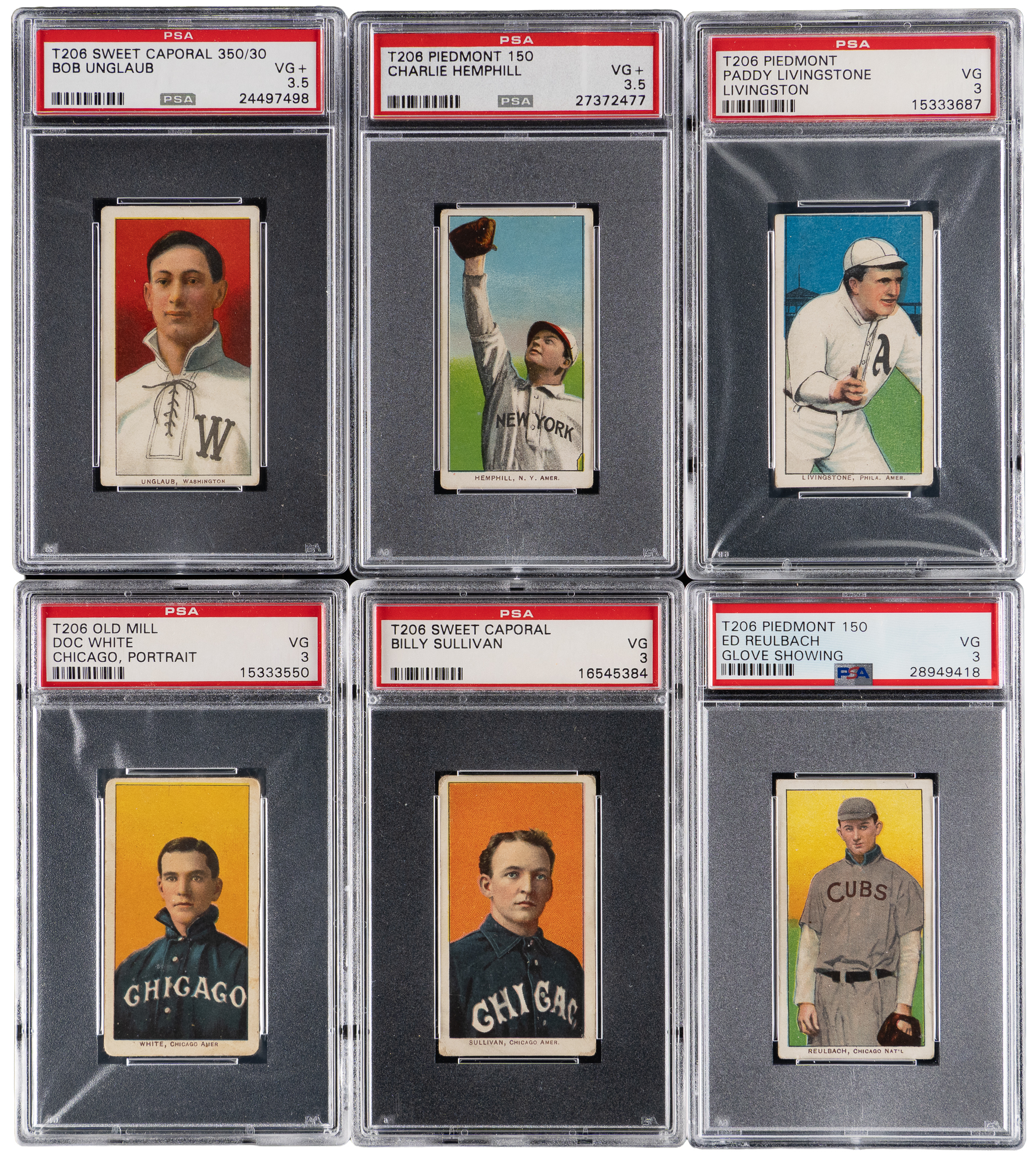 Each graded either VG 3 or VG+ 3.5 by PSA with common advertising backs (unless noted). Handsome selection of (6) different 1909-1911 T206 White Border tobacco cards. Subjects include: PSA VG+ 3.5: (2 cards) with Hemphill, Unglaub; PSA VG 3: (4 cards) with Livingston(e), Reulbach (Glove Showing), Sullivan and D. White (Portrait, Old Mill).