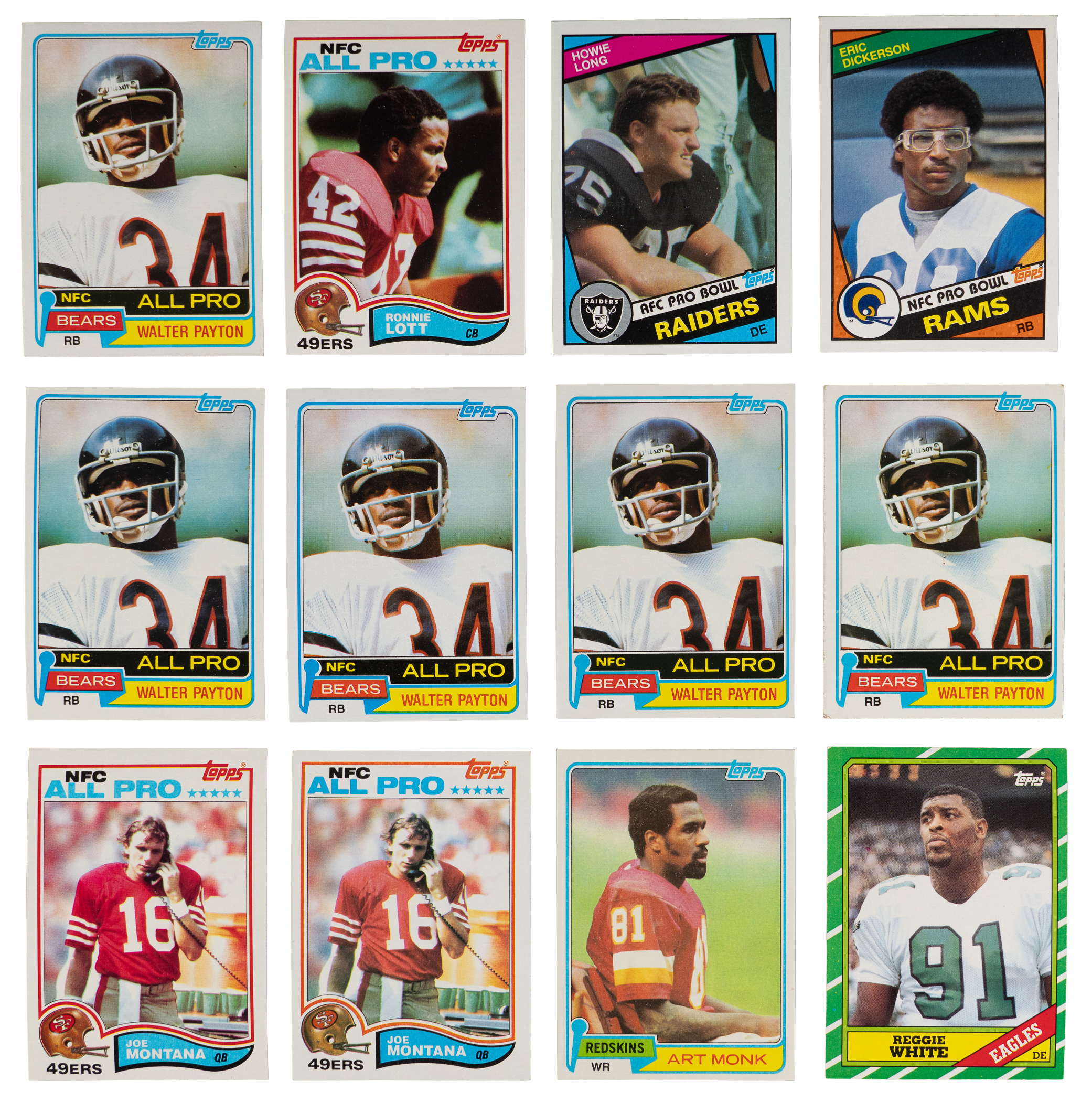 1981 Topps: (21 stars, average EX-MT to NM) with (3) #150 Winslow RC (all EX-MT), (3) #194 Monk RC (NM, EX-MT, GD), (2) #216 Montana RC (both NM), (11) #400 Payton (average EX-MT);