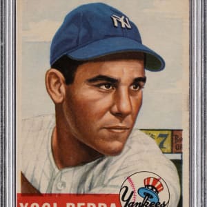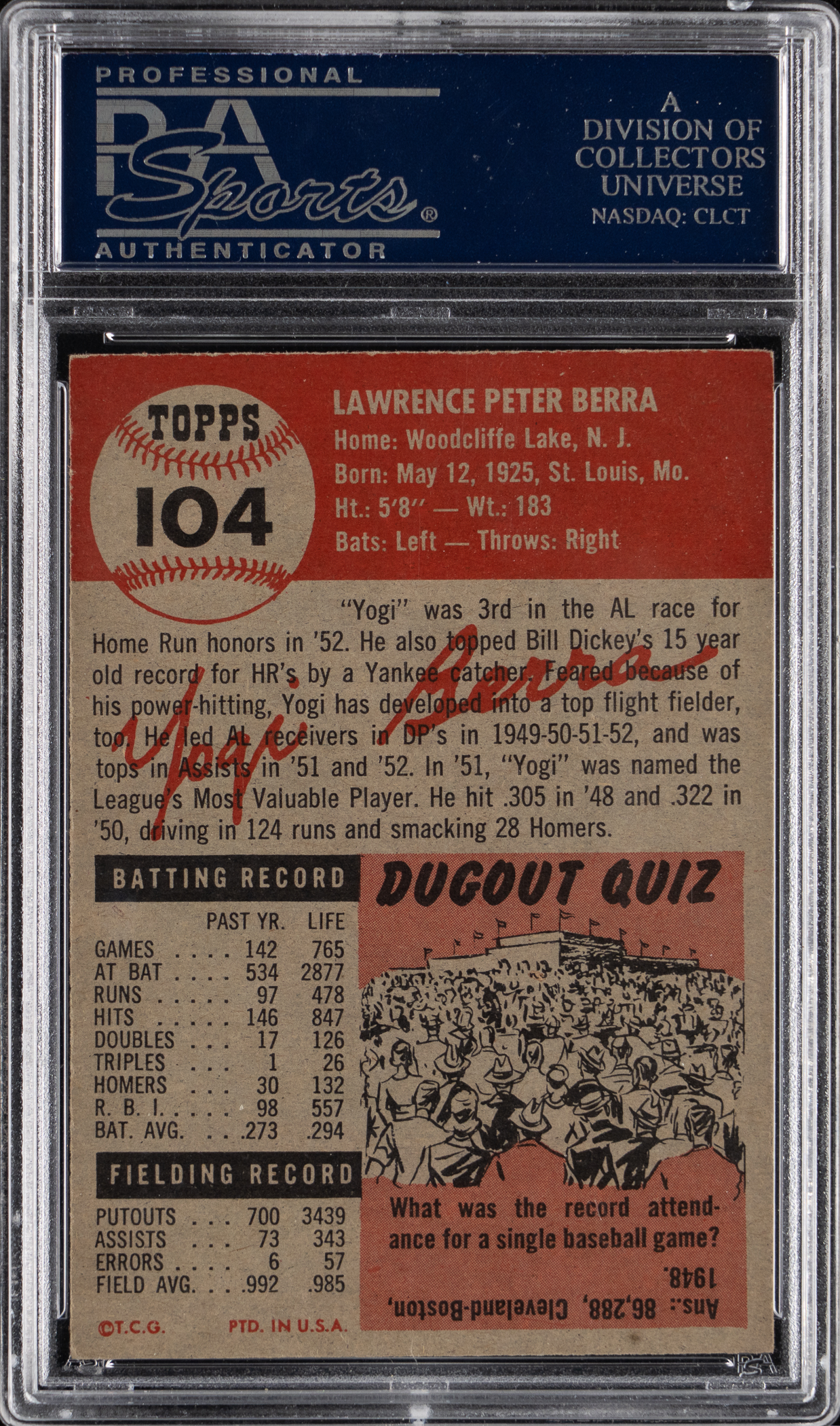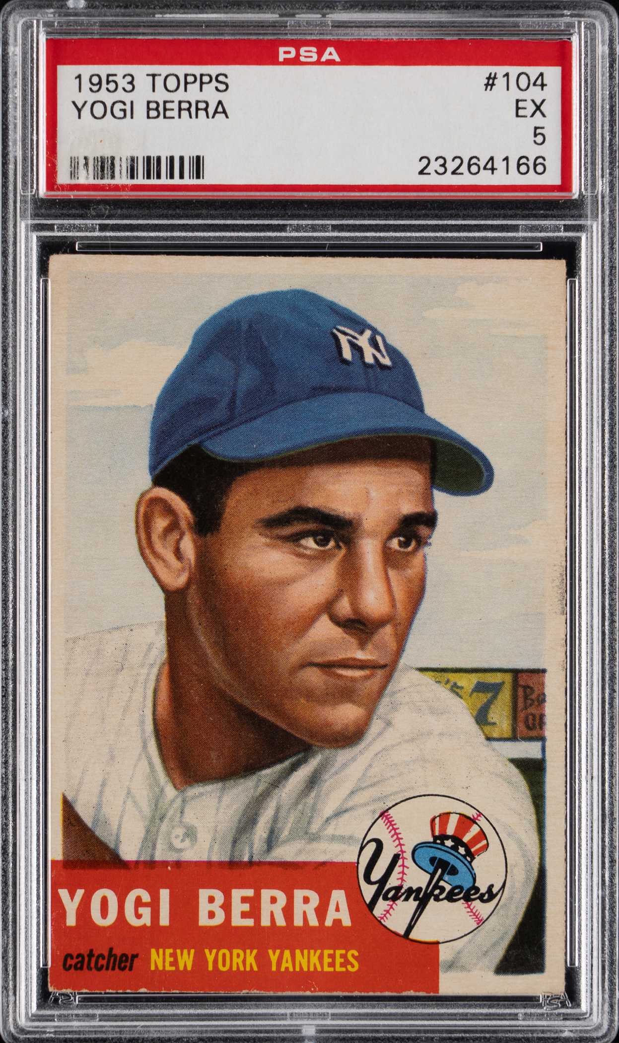 Graded EX 5 by PSA. The typically jovial Yogi Berra casts an unfamiliar deadpan on his 1953 Topps #104 single. New York Yankees Hall of Fame catcher.