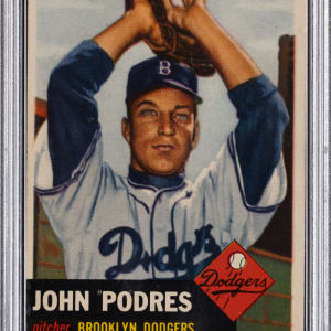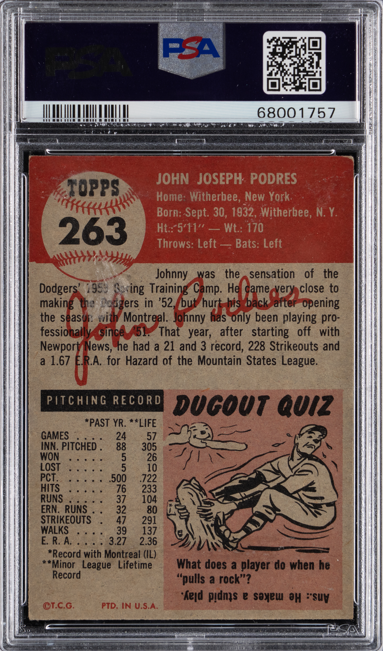 Graded VG-EX 4 by PSA. The rookie high number of Brooklyn Dodgers star pitcher (and World Series hero) Johnny Podres. Shortprint.