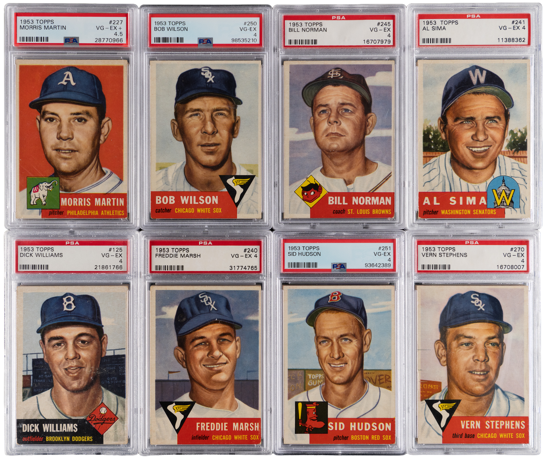 Each graded either VG-EX 4 or VG-EX+ 4.5 by PSA. Select 1953 Topps starter set of (114) different cards with (31) high numbers. Includes: