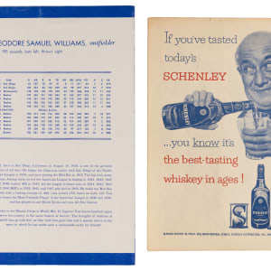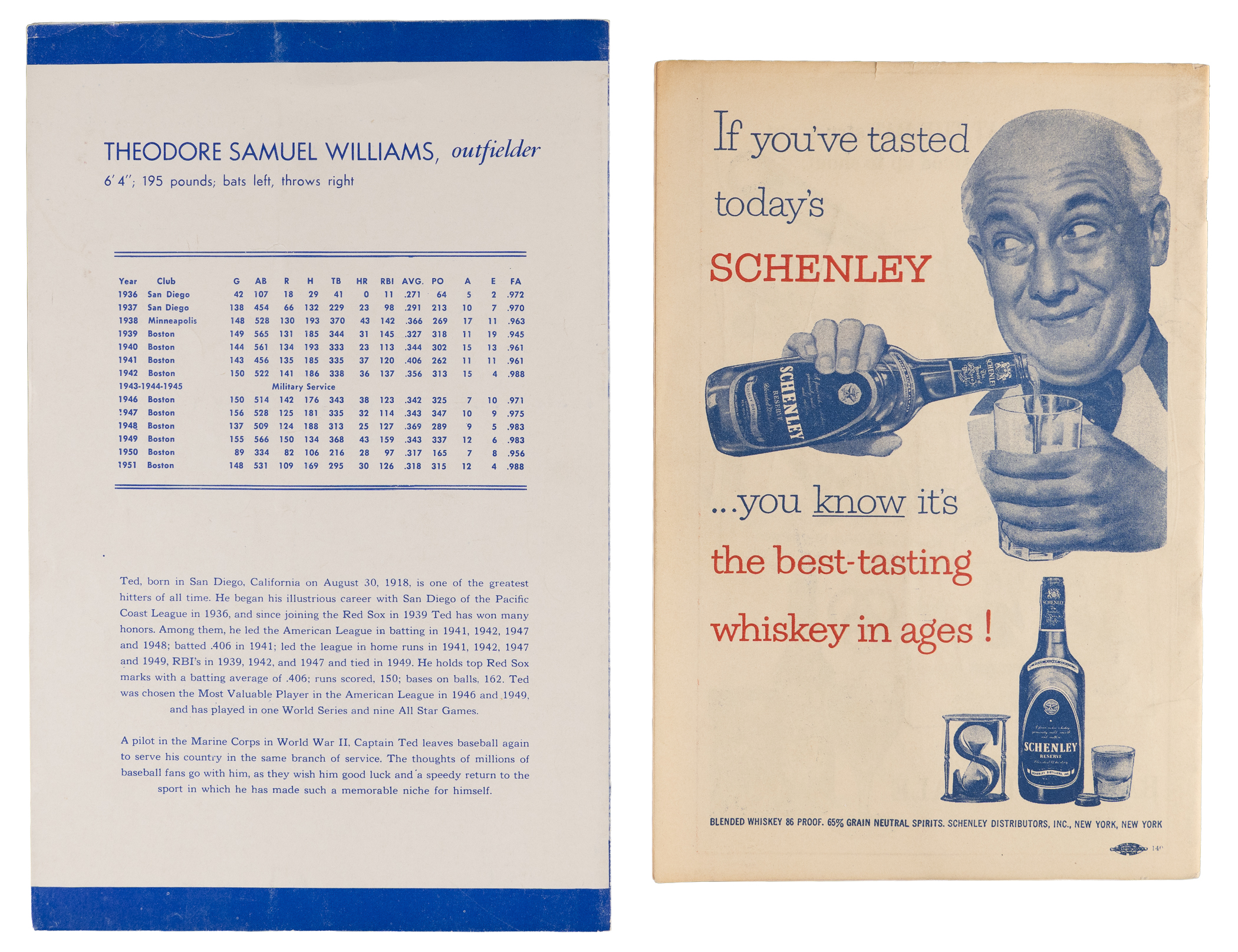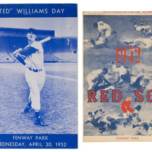 The offered program is a Red Sox standard issue, with an added larger format cover. Williams is pictured on the front of the special cover, which is titled "Ted Williams Day" at top. The site "Fenway Park", and date "Wednesday, April 30, 1952" are printed at bottom. True to his determined nature, Williams took Detroit Tigers hurler "Dizzy" Trout deep in the bottom of the 7th inning, for a two-run, game-winning homer, in his last at-bat before heading off to Korea, where he flew 39 combat missions. With deference to a pair of staple removal holes near the top-right corner, the special cover shows Vg+ details. The standard program has a 4" spine split at top, otherwise it shows Ex details.