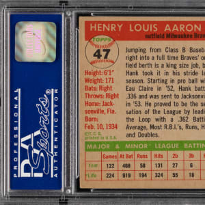 Graded EX-MT 6 by PSA. Hard-hitting 1955 Topps #47 Hank Aaron second-year card. This sophomore example of the Milwaukee Braves Hall of Fame slugger displays fine overall eye appeal with relatively accurate centering, intense dual action/portrait surface colors, and a clean "True or False" reverse.