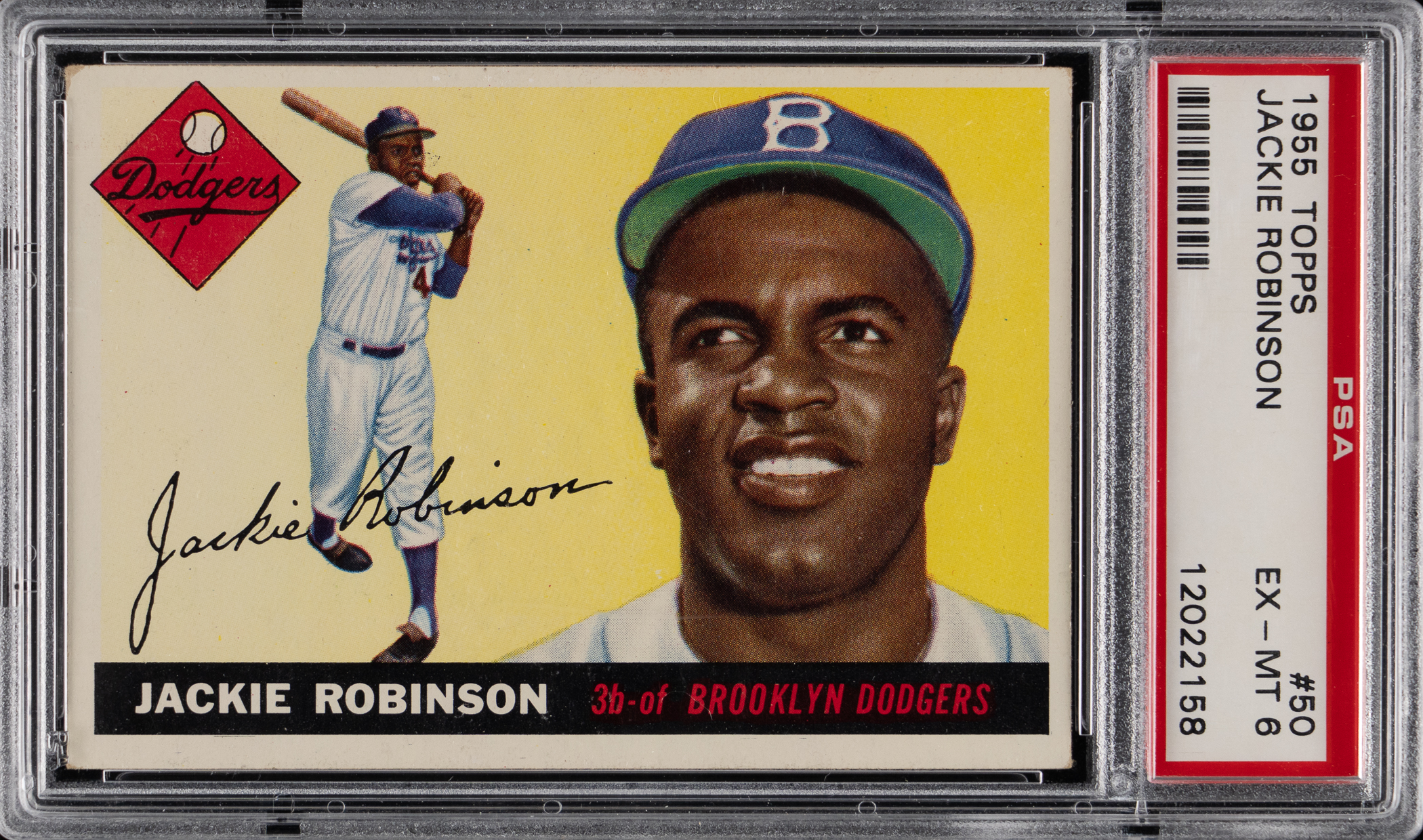 Graded EX-MT 6 by PSA. The second-to-last flagship card of Brooklyn Dodgers Hall of Famer Jackie Robinson. Full diamond version.