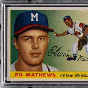 Graded NM 7 by PSA. A clean 1955 Topps #155 gum card of Milwaukee Braves Hall of Fame third baseman Eddie Mathews.