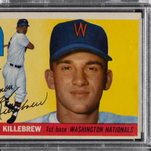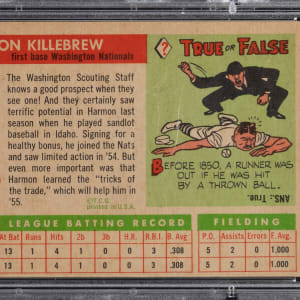 Graded EX-MT 6 by PSA. Fresh from the ballfields of Idaho, a teenage Harmon Killebrew swings away on his 1955 Topps #124 rookie card. This dual action/portrait setting of the future 500 Home Run Club member is quite clean with mostly solid corners and virtually untouched edges. The color sequences are blazing and the "True or False" reverse is wax stain-free.