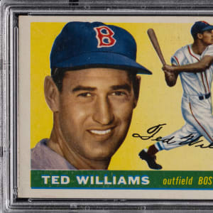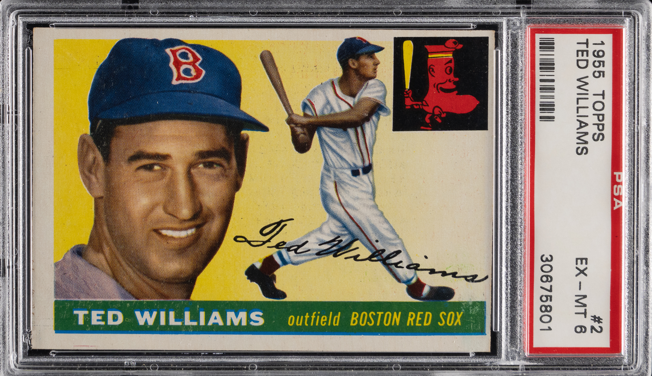 Graded EX-MT 6 by PSA. "Mr. Baseball" goes full swing on the offered 1955 Topps #2 Ted Williams single. This prominent dual action/portrait pose of the Boston Red Sox Hall of Fame slugger displays fantastic eye appeal with shimmering surface colors.