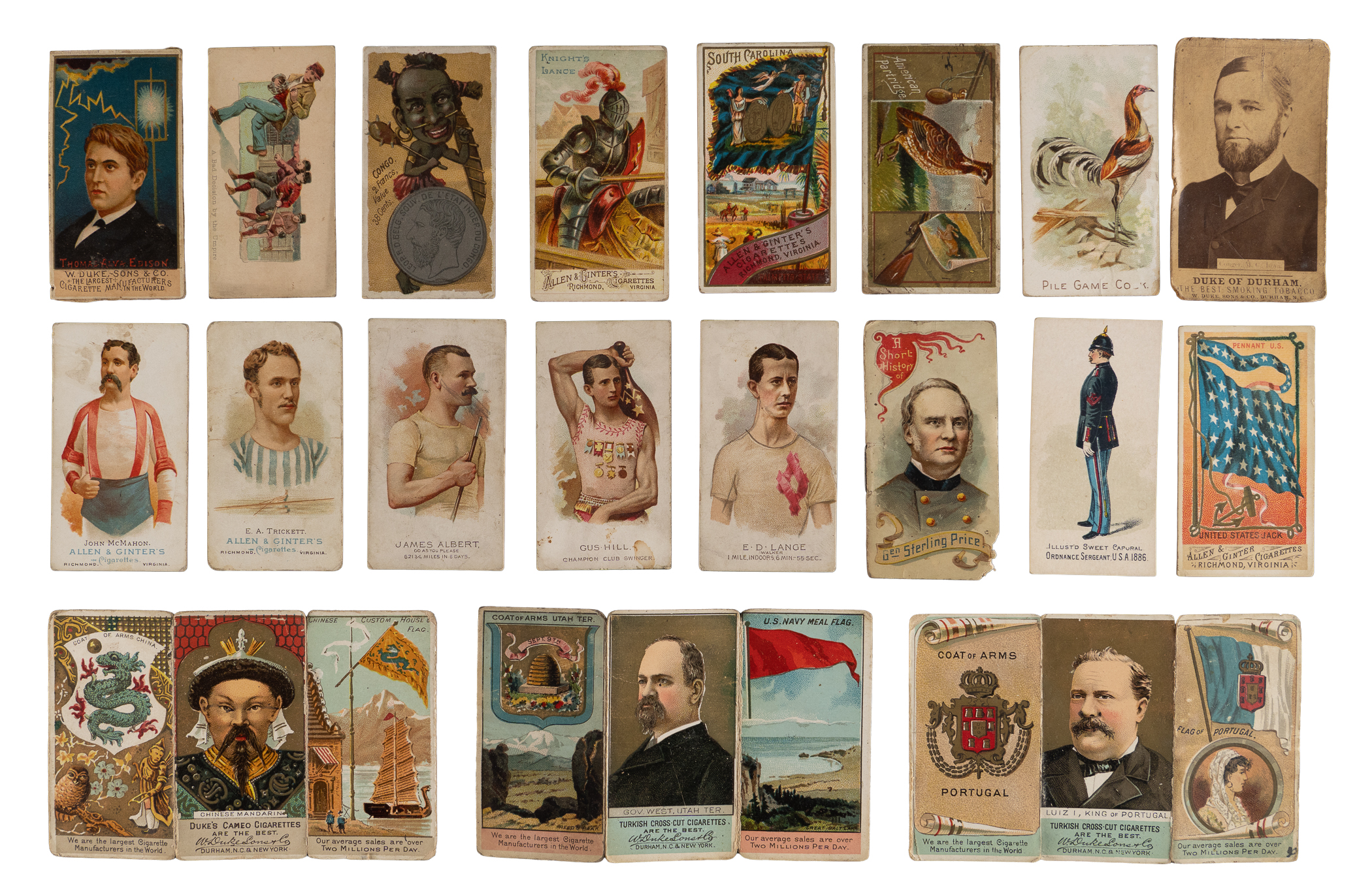 (8) 1888 N28 Allen & Ginter Worlds Champions: Carney (GD), (2) Dempsey (one FR, one trimmed), Sorakichi (FR, reverse writing);