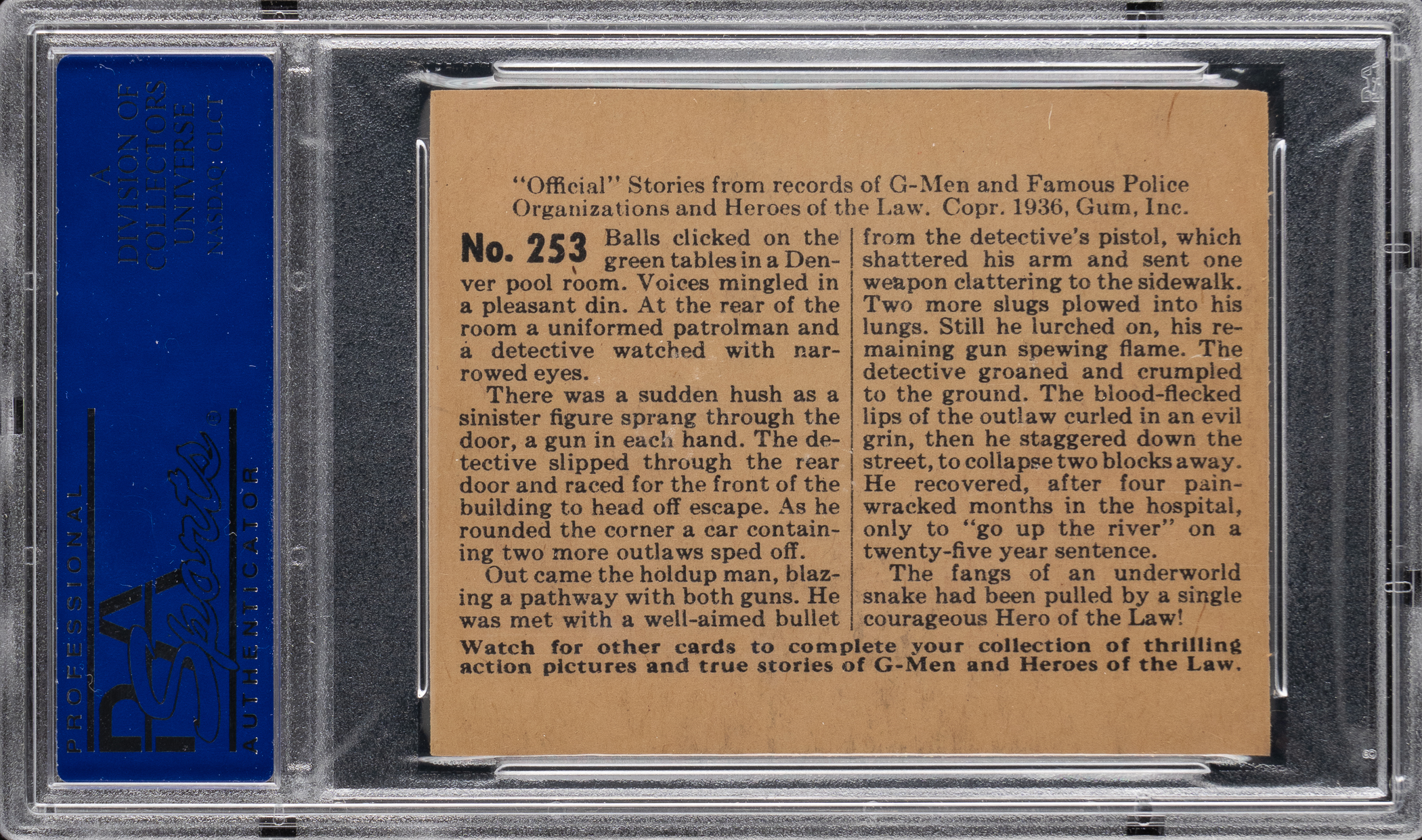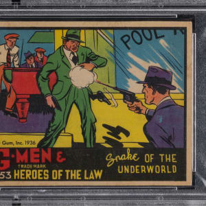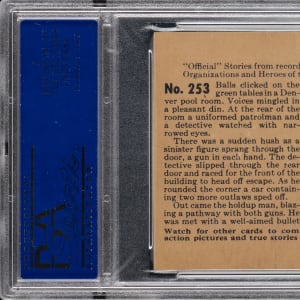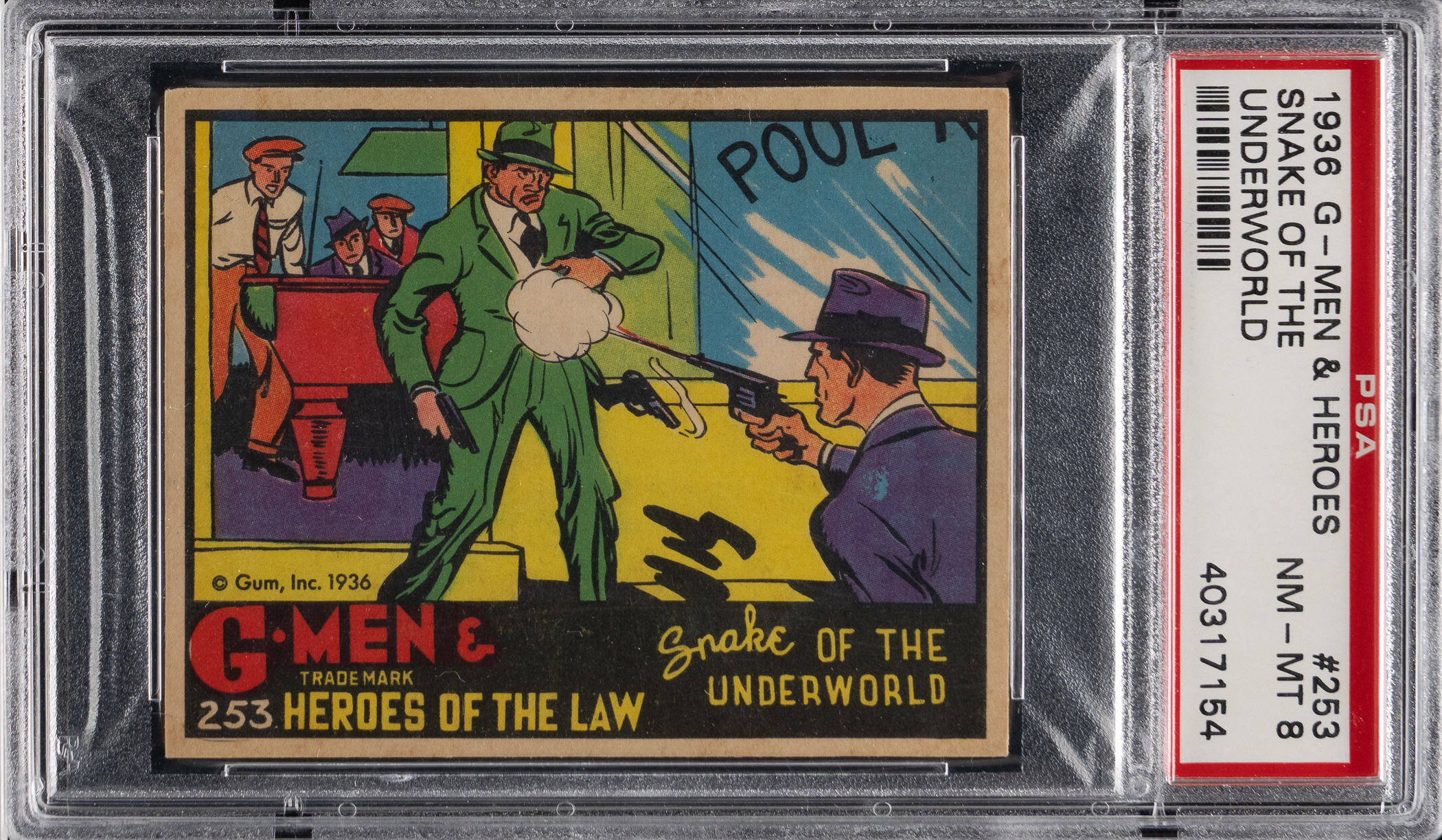 Graded NM-MT 8 by PSA. Boost your registry standing with the offered 1936 Gum Inc. R60 G-Men & Heroes of the Law #253 "Snakes of the Underworld" card. Of the 20 total copies of the tougher Group 7 blazer judged by the authenticator, this shootout survives as 1 of 4 at the grading level with none better!