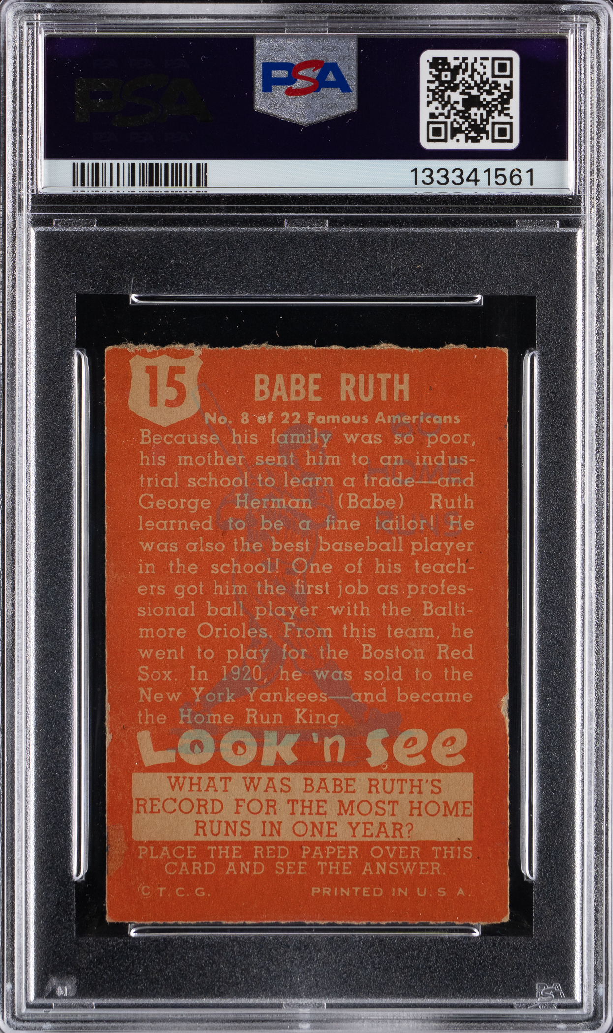 Graded NM 7 by PSA. The immortal Babe Ruth is celebrated on the offered 1952 Topps Look 'N See #15 example. An upper tier "Bambino" that meets the criteria needed for its overall assessment.