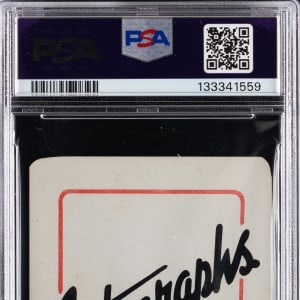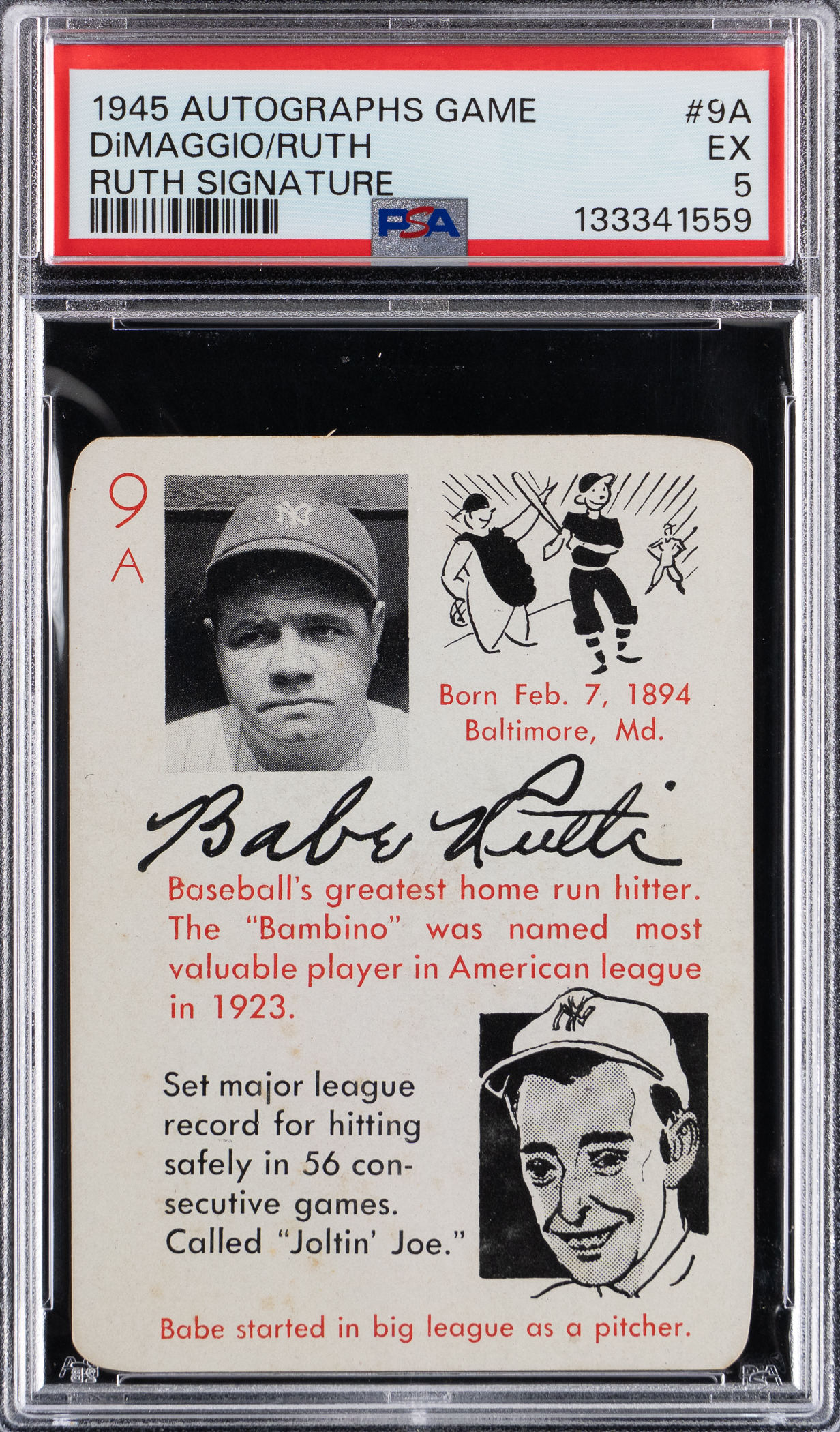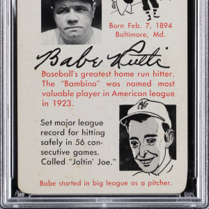Graded EX 5 by PSA. Permanent fixtures of Monument Park are paired with the offered 1945 Leister Autographs Game #9A Babe Ruth/Joe DiMaggio combo with a Babe Ruth facsimile autograph. One of very few releases during World War II.