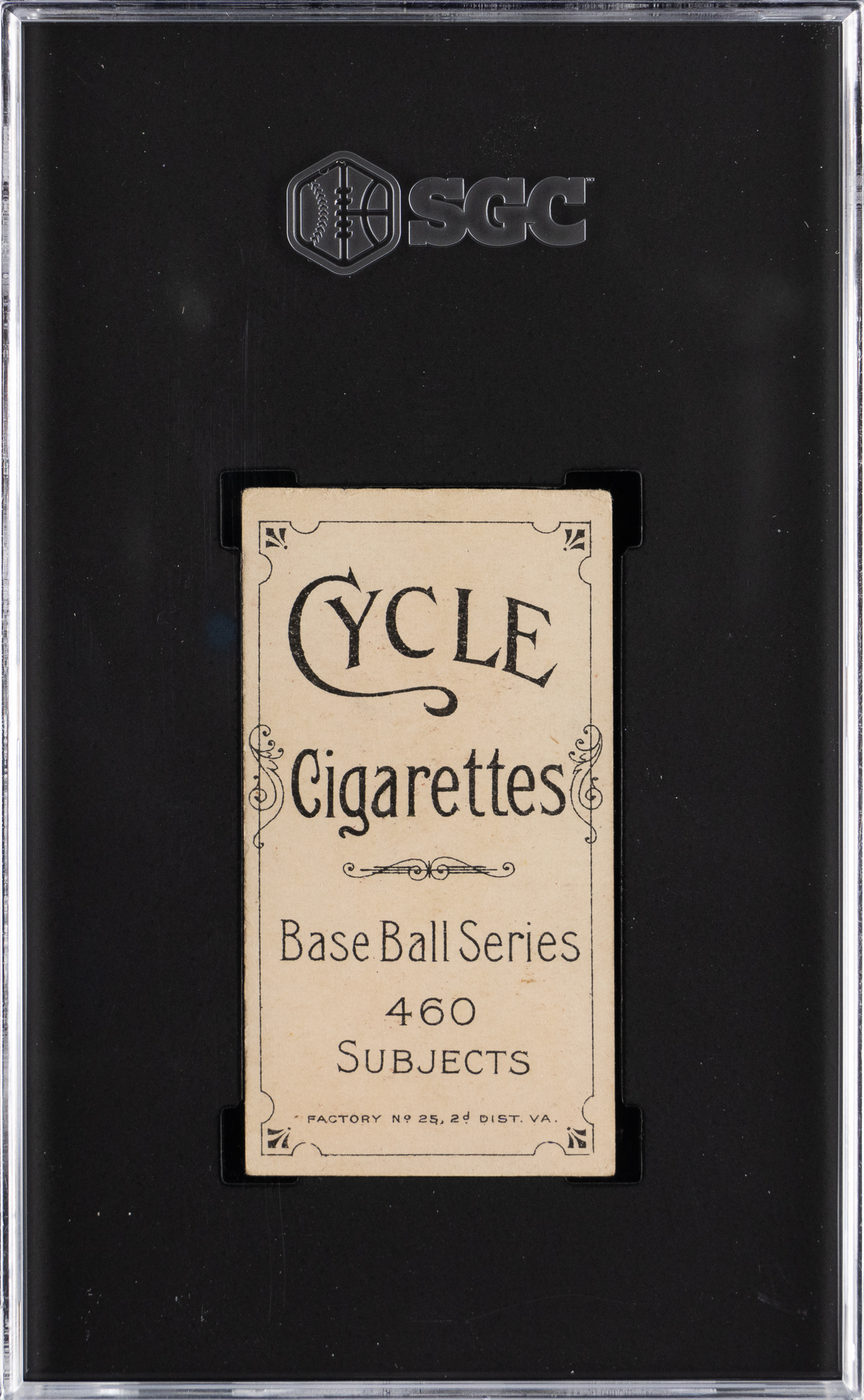 Graded VG+ 3.5 by SGC. A tough variation and difficult back merge for the offered 1909-1911 T206 White Borders Red Kleinow "Boston" variation with a tough Cycle 460 Subjects advertising back. Only 8 total copies of player/pose/brand combination have been judged by the grading service.