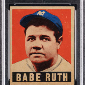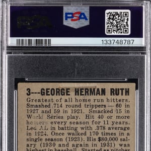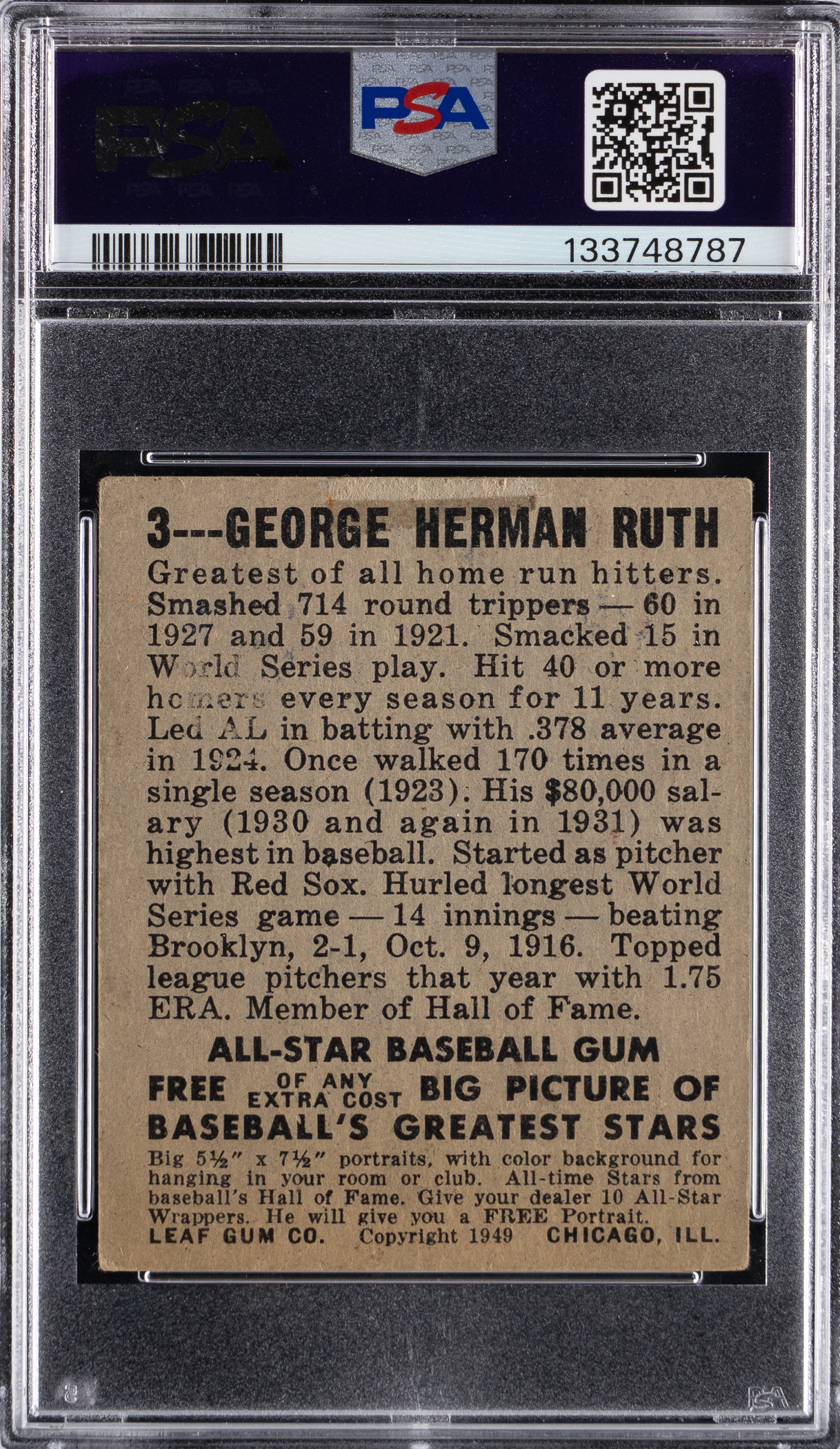Graded GOOD 2 by PSA. The Leaf Gum Company of Chicago was wise in placing the immortal Babe Ruth in their inaugural (and only) gum card product. The front of the offered #3 Ruth portrait is properly centered with limited corner/edge wear and bold surface colors. Slight paper pulling at the top of the biographical reverse accounts for its overall assessment.