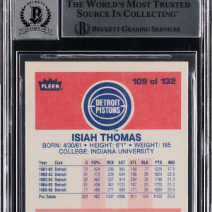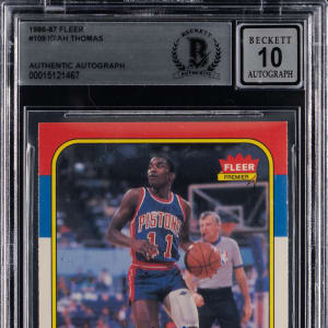 Zeke! Signature judged Authentic by Beckett and awarded a "10" Autograph grade. "Bad Boys" point guard Isiah Thomas directs traffic on this signed 1986-1987 Fleer Basketball #109 rookie card. The signature of the Detroit Pistons Hall of Famer is perfectly placed in blue Sharpie with the clean surface grading in overall (NM) condition.